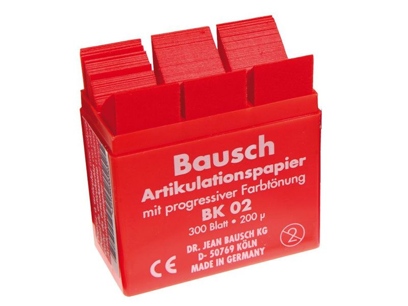 ВК 02 артикуляционная бумага, 300 листов (красная) пластиковая кассета Бауша толщиной 200 мкм с нарастающей интенсивностью цвета является единственным видом бумаги, позволяющим представить жевательную силу различной интенсивности в виде цветных отображений с оттенками, зависящими от величины нагрузки: МАЛОЕ ДАВЛЕНИЕ ПРИ НАКУСЫВАНИИ ОТОБРАЖАЕТСЯ БОЛЕЕ СВЕТЛЫМ, А БОЛЬШОЕ ДАВЛЕНИЕ – БОЛЕЕ ТЁМНЫМ ОТПЕЧАТКОМ. В считанные секунды получает стоматолог точный профиль распределения жевательного давления. Преждевременные контакты становятся моментально чётко видимыми и могут быть целенаправленно сошлифованы. Только артикуляционная бумага Бауша толщиной 200 мкм с нарастающей интенсивностью цвета способна так надёжно регистрировать имеющиеся завышения на контактных пунктах.