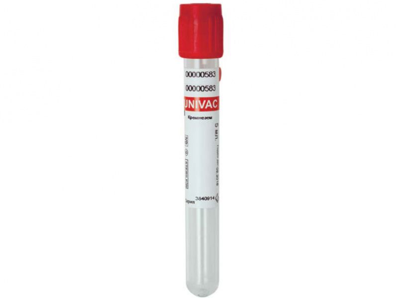 Пробирка вакуумная для исследования сыворотки Univac 4 мл, 13*75 мм, с активатором свертывания крови (кремнезем), цвет крышки красный, 100 шт/упаковка, Россия (Эйлитон) 1375.4.0.АК