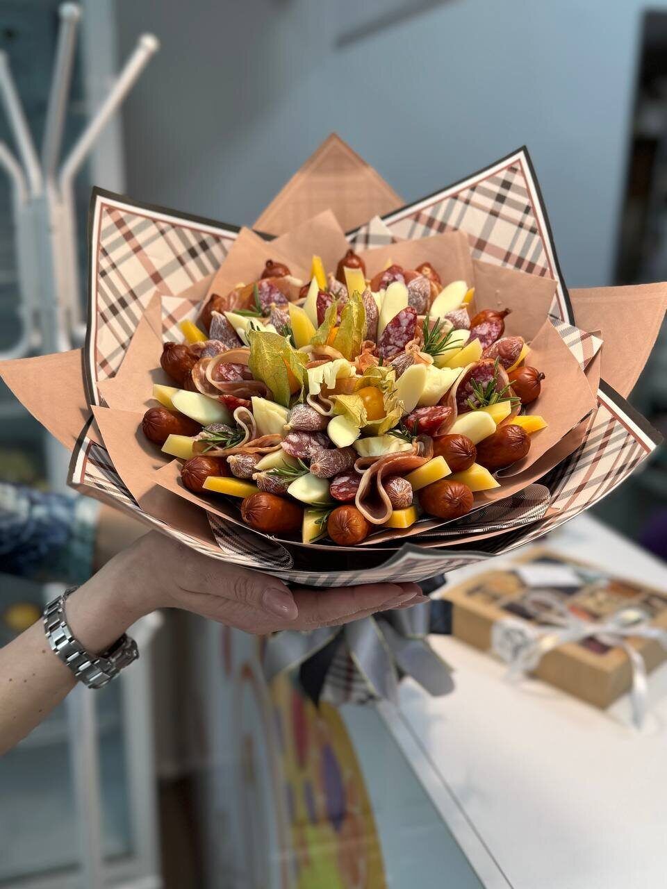 Букет для настоящих мужчин. Для тех кто не идет на компромисс и не ищет лёгких путей. Состав: охотничьи колбаски, немецкие колбаски, мини салями, сыр чечил, зеленый и красный острый перец, багет с сыром. Вес: 2 кг4 500 ₽Order in advance -