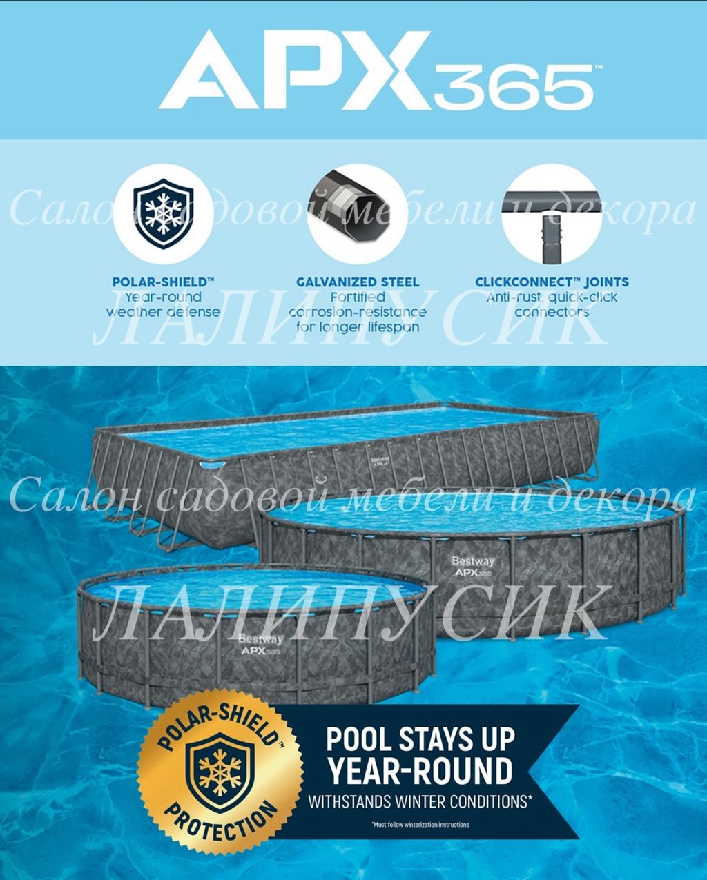 Установка круглый год: бассейны APX 365 — первые наземные бассейны на рынке, оснащенные технологией защиты от атмосферных воздействий Polar Shield. Вы можете обустроить бассейны летом для семейного купания и оставить их зимой — нет необходимости хранить их вне сезона! Polar Shield защищает покрытие бассейна от вредных погодных воздействий даже при низких температурах. Прочная конструкция: бассейн изготовлен из коррозионностойкой оцинкованной стали и рассчитан на максимальную долговечность. Каркас изготовлен из 100% оцинкованной стали, что предотвращает появление ржавчины и атмосферных повреждений. Благодаря соединениям ClickConnect бассейн легко настроить — не требуются дополнительные инструменты или аксессуары. Т-образные соединители предотвращают контакт металла с металлом, повышая устойчивость к ржавчине. Прочная облицовка бассейна TriTech изготовлена из прочного трехслойного материала, усиленного для повышения прочности и устойчивости к разрыву. TriTech на 15% более устойчив к разрыву, на 33% более устойчив к растяжению и на 83% более долговечен, чем стандартный ПВХ, поэтому ваш бассейн прослужит много лет.