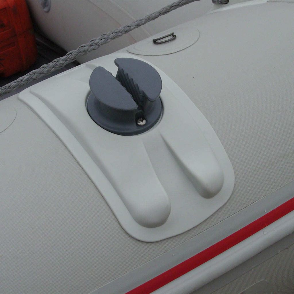 Транец лодки изготовлен из водостойкой фанеры, полностью покрытой прочным пластиком, защищающим его от воздействия воды. По верхнему краю установлена П-образная пластиковая накладка, предохраняющая от повреждений при контакте с мотором. Транец надежно зафиксирован U-образными ПВХ профилями и рассчитан на мотор до 10 л.с. Скошенные концевики баллонов улучшают скоростные характеристики и повышают устойчивость лодки на глиссировании.