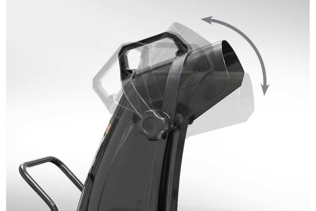- Желоб для выброса снега. Изготовлен из металла и находится в удобном месте и позволяет перенаправлять выброс снега до 190 градусов с помощью рычага.