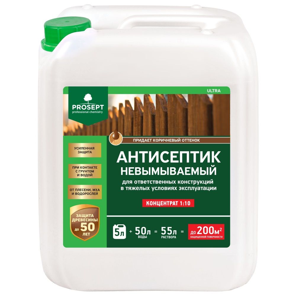 PROSEPT ULTRA - невымываемый антисептик для конструкций из древесины, эксплуатируемой в наиболее неблагоприятных условиях, концентрат 1 + 10 л, (5 + 50 л) коричневый.
