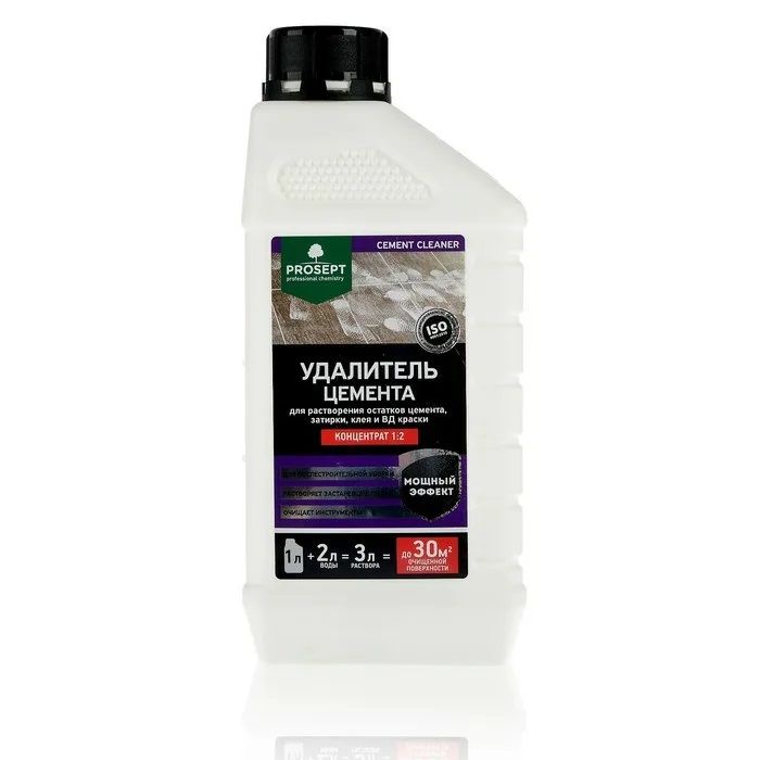 Очиститель цемента ПРОСЕПТ - это концентрированное средство для очистки строительных материалов и инструмента от цементных загрязнений, копоти и солевых отложений, для удаления остатков цементных растворов с любых поверхностей, очистки кирпичных стен от бетонных брызг, остатков кладочного раствора, извести и высолов, удаления плиточного клея и затирки для швов, для уборки помещений после строительства, чистки оборудования для приготовления и транспортировки бетона, для мытья форм при изготовлении тротуарной плитки, удаления серы и копоти с фасадов зданий.
