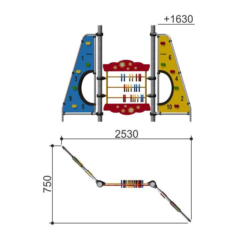 Панельный игровой комплекс– это яркие две треугольные панели-скалодромы с цифрами соединенные счетами. Развивает ловкость, мышцы, фантазию и помогает в обучении счету.