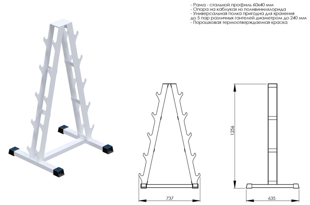 • Универсальная полка пригодна для хранения до 5 пар различных гантелей диаметром до 240мм;