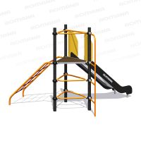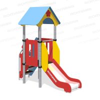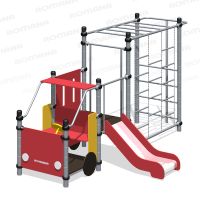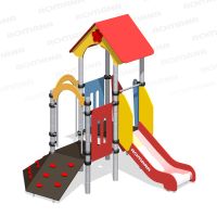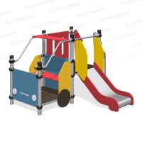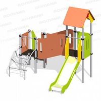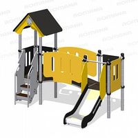 Игровой комплекс представляет собой сборно-разборную конструкцию, выполненную в форме корабля. Комплекс имеет площадки, стоящие на двух уровнях. Верхняя площадка выполнена в виде юта, к ней же крепится горка высотой 650 мм. нижняя площадка находится на высоте 200 мм от поверхности площадки. К нижней площадке подведен скат шириной 1000 мм.