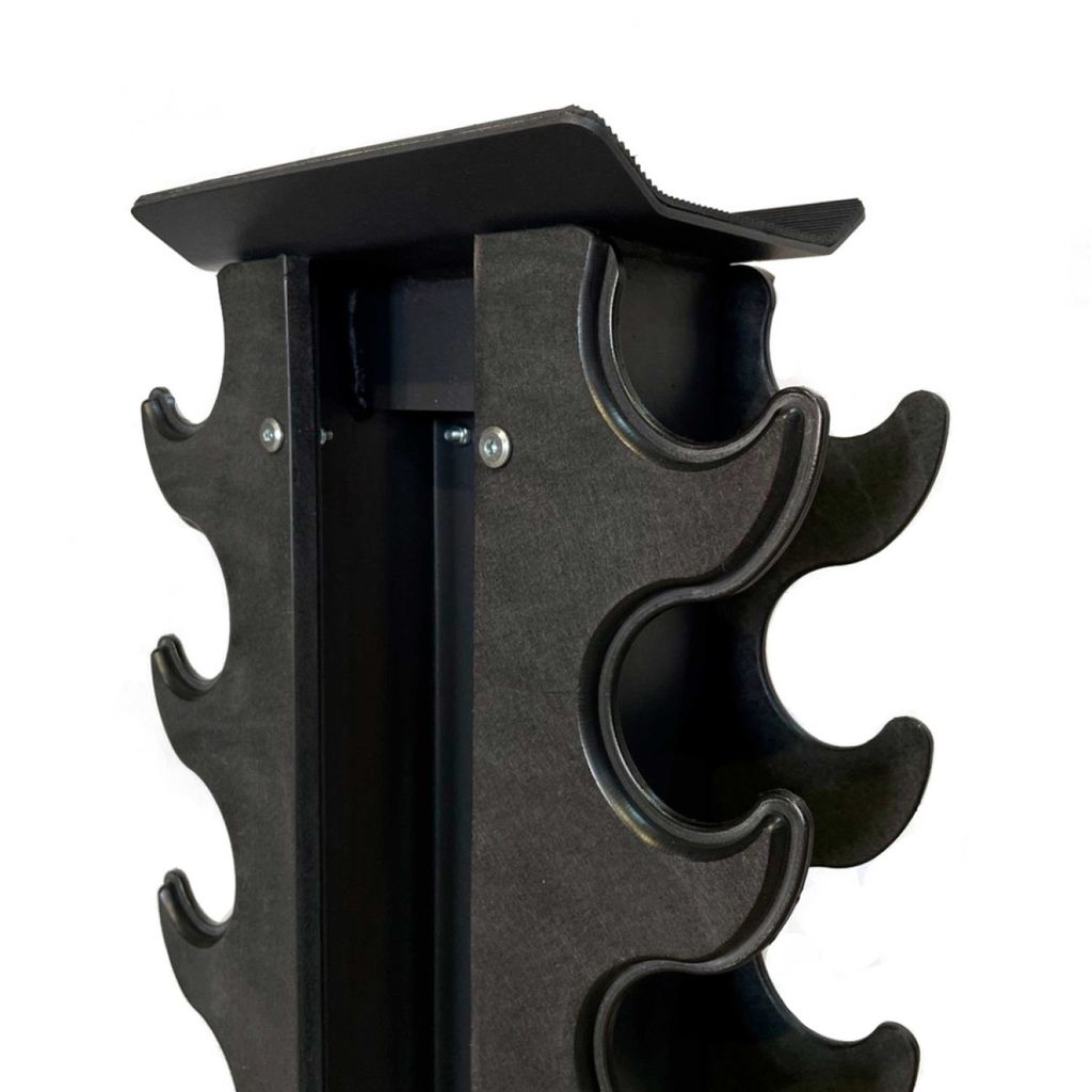Стойка предназначена для хранения и удобного использования гантелей ряда CHROME и гексагональных обрезиненных гантелей весом 1-10 кг, длиной рукояти не менее 110 мм. Представляет собой сборную металлическую конструкцию с двумя вертикальными полками и ложементами под гантели.