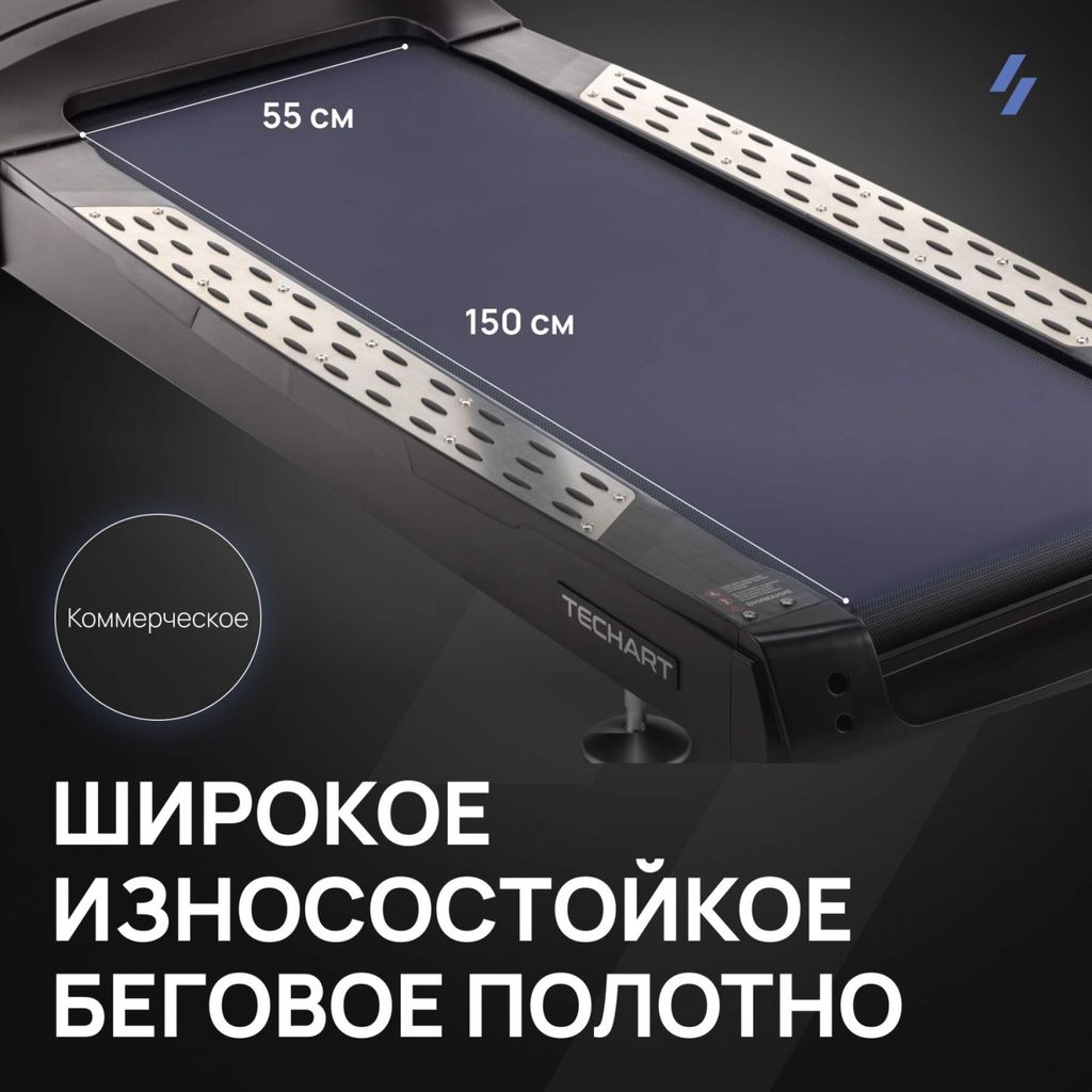 Технические характеристики беговой дорожки Techart продуманы до мельчайших деталей, чтобы удовлетворить потребности самых требовательных пользователей. Двигатель мощностью 4,5 л.с. с пиковой нагрузкой до 7 л.с. обеспечивает плавный и мощный ход при скорости от 1 до 20 км/ч. Широкое и износостойкое беговое полотно длиной 150 см и шириной 55 см даёт достаточно пространства для комфортных и безопасных тренировок. Электронная регулировка угла наклона с диапазоном от 0 до 18% позволяет варьировать нагрузку, обеспечивая разнообразие тренировок. Модель оснащена транспортировочными роликами и компенсаторами неровностей пола, что делает её удобной в эксплуатации в любых условиях.
