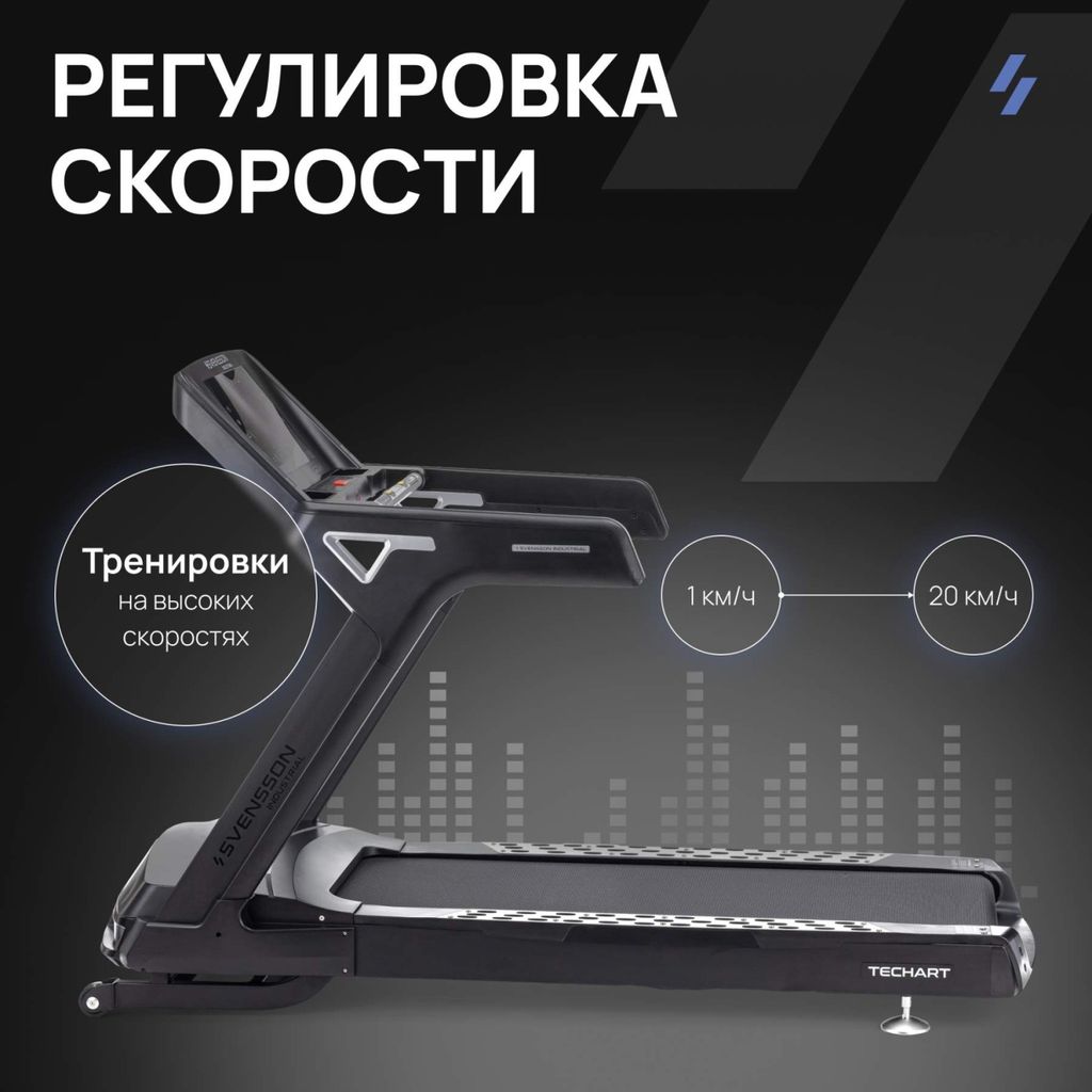 Techart выполнена в элегантной палитре черного и серого цветов, с добавлением металлических элементов, которые придают модели уникальный стиль и солидность. Лаконичные и выверенные формы дорожки подчеркивают её современный характер, а металлические вставки, гармонично интегрированные в дизайн, придают изюминку и подчёркивают её статус как премиального оборудования. Эти детали не только визуально привлекательны, но и акцентируют внимание на долговечности и высоком качестве конструкции.