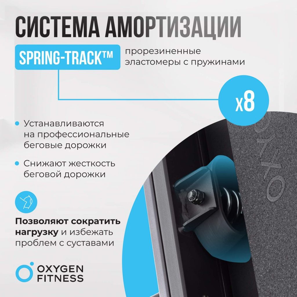 Но это еще не все! Электрическая регулировка угла наклона и система амортизации с 8 прорезиненными эластомерами с пружинами SPRING-TRACK™ обеспечивают оптимальные условия для тренировок, вне зависимости от уровня вашей подготовки. Ваши суставы будут защищены, а нагрузка распределена равномерно, что делает каждую пробежку приятной и полезной.