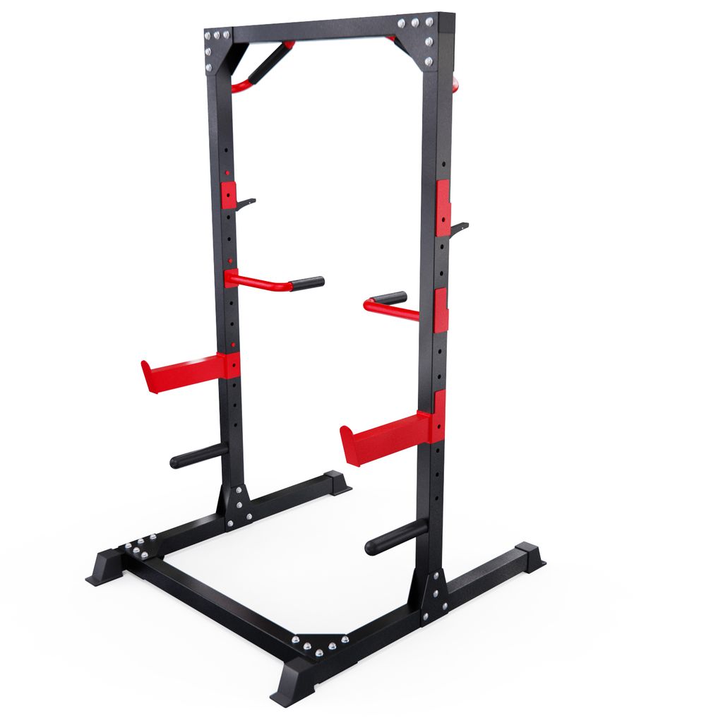 2 пары держателей для штанги регулируются на 12 уровней по высоте. Максимальная нагрузка на держатели штанги 150 кг. Для хранения дисков предусмотрены 2 держателя по углам тренажера длиной 25 см (диаметр 25 мм), а также переходная втулка (диаметр 50 мм). Максимальная нагрузка на каждый держатель для дисков 60 кг. Нескользящие ножки надежно устанавливаются на полу и не царапают поверхность.