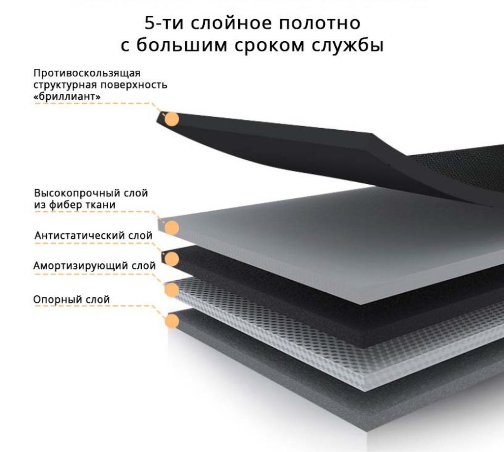- 5-ти слойное беговое полотно со структурным покрытием "бриллиант" - нескользящее, прочное, с увеличенным сроком эксплуатации. Состоит из следующих слоев: антискользящий слой со структурной поверхностью, плотные слой из фибер ткани, антистатический слой, амортизирующий слой, поддерживающий слой.