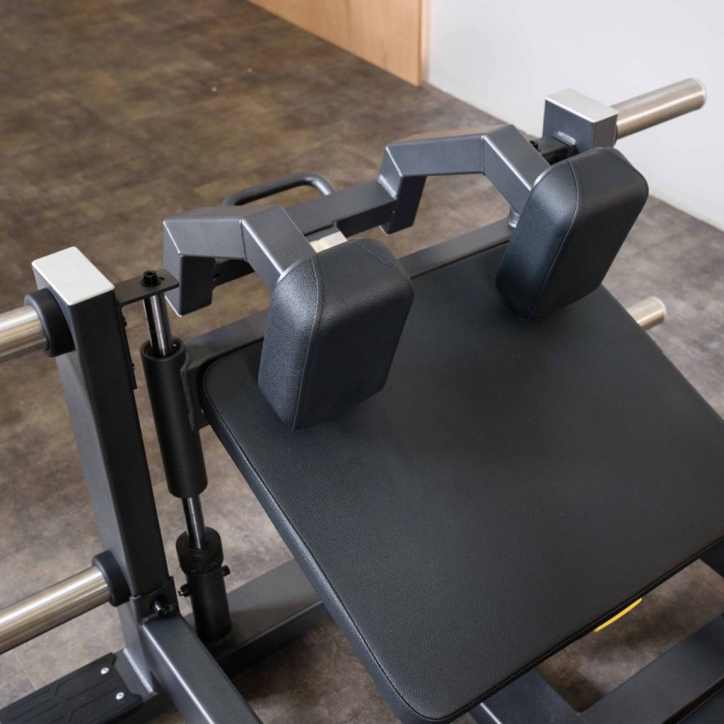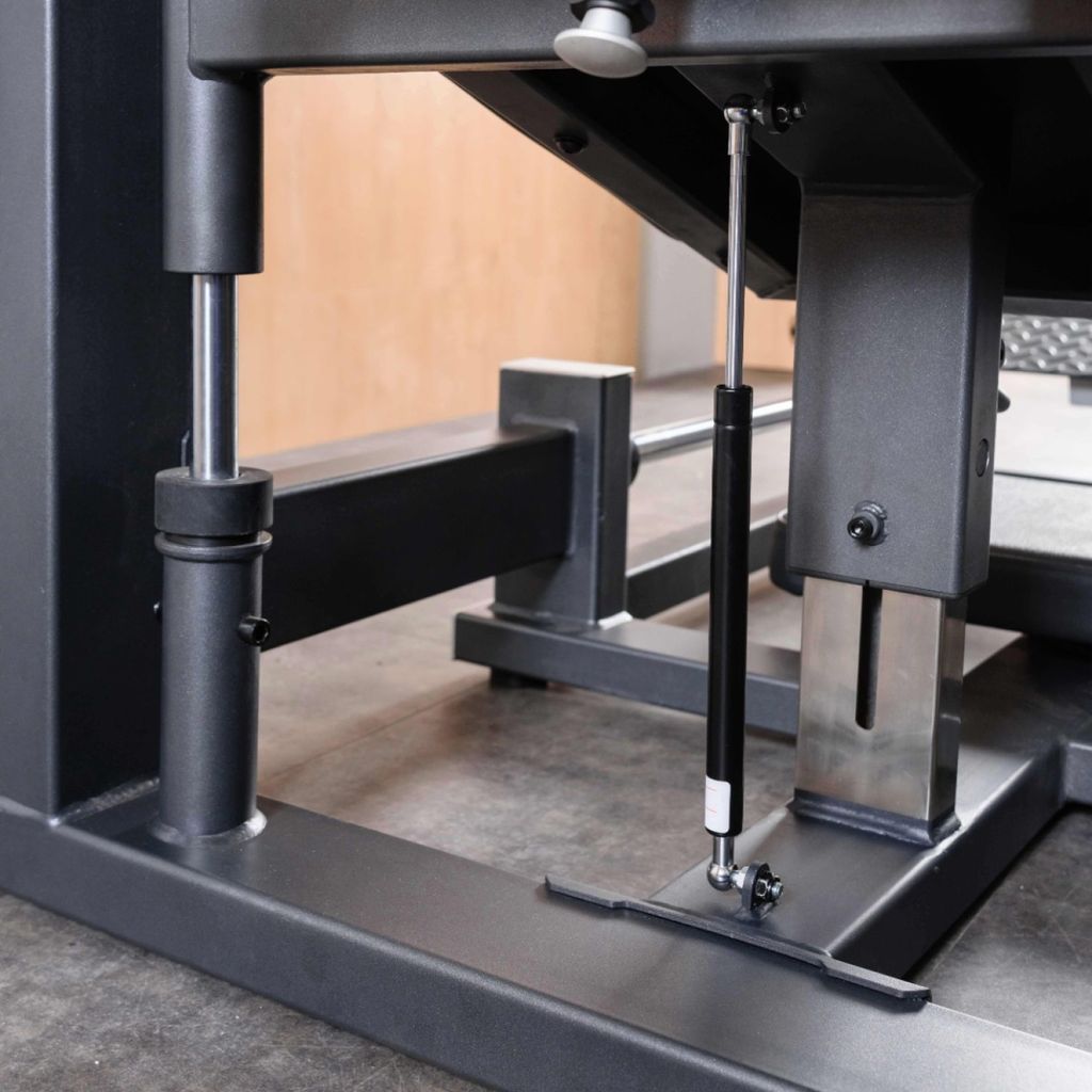 • Пара направляющих для плавного движения грифа с валиком для фиксации бёдер по вертикали выполнены из нержавеющей трубы.