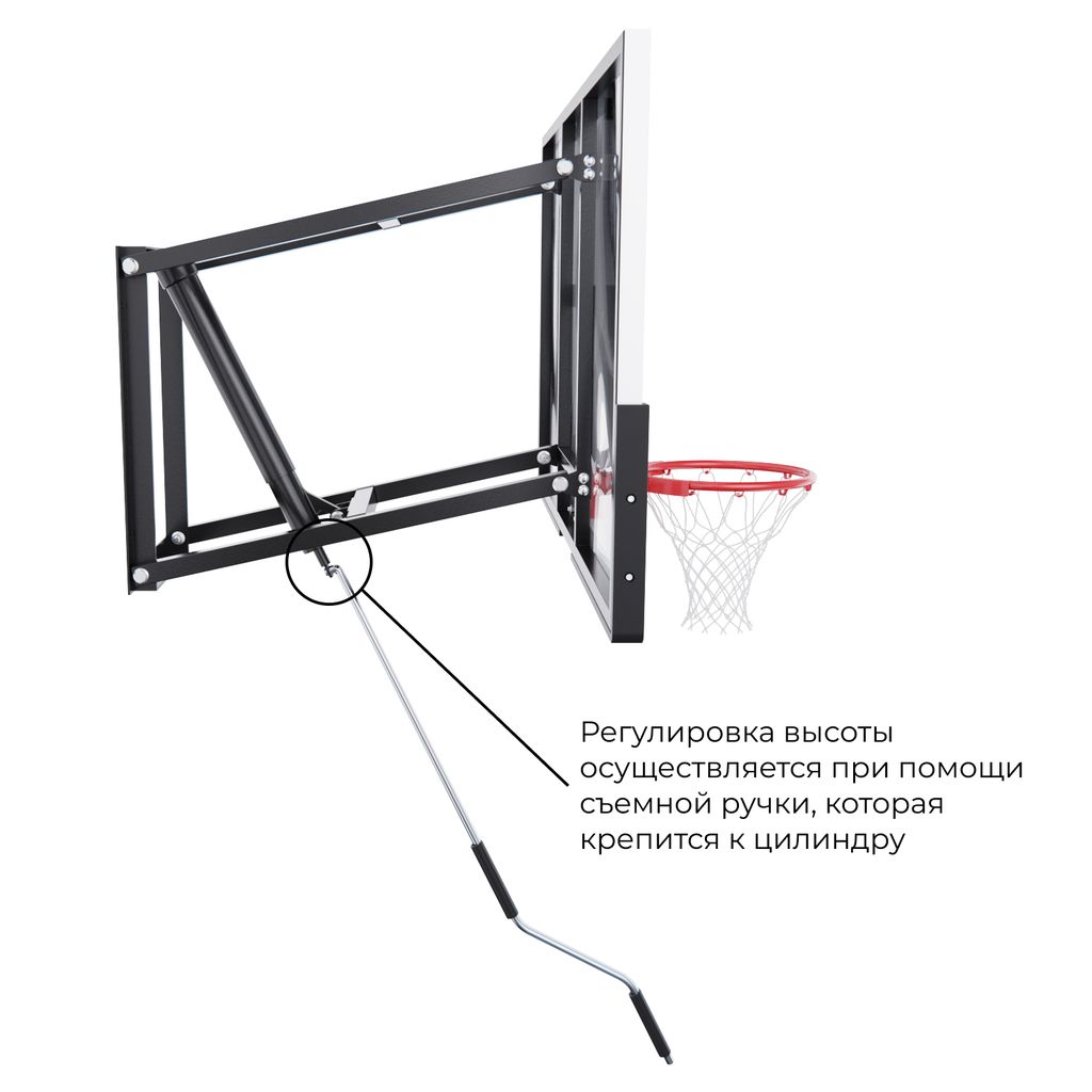 Кольцо стандартного диаметра 45 см устойчиво к интенсивной нагрузке. Высоту кольца можно регулировать от 227 до 305 см при помощи съёмной ручки, которая крепится к цилиндру, благодаря чему можно адаптировать баскетбольный щит под любой уровень подготовки и возраст игроков. Это особенно удобно при тренировках с детьми или в семейных играх. В целях безопасности запрещается висеть на кольце и других элементах баскетбольного щита.