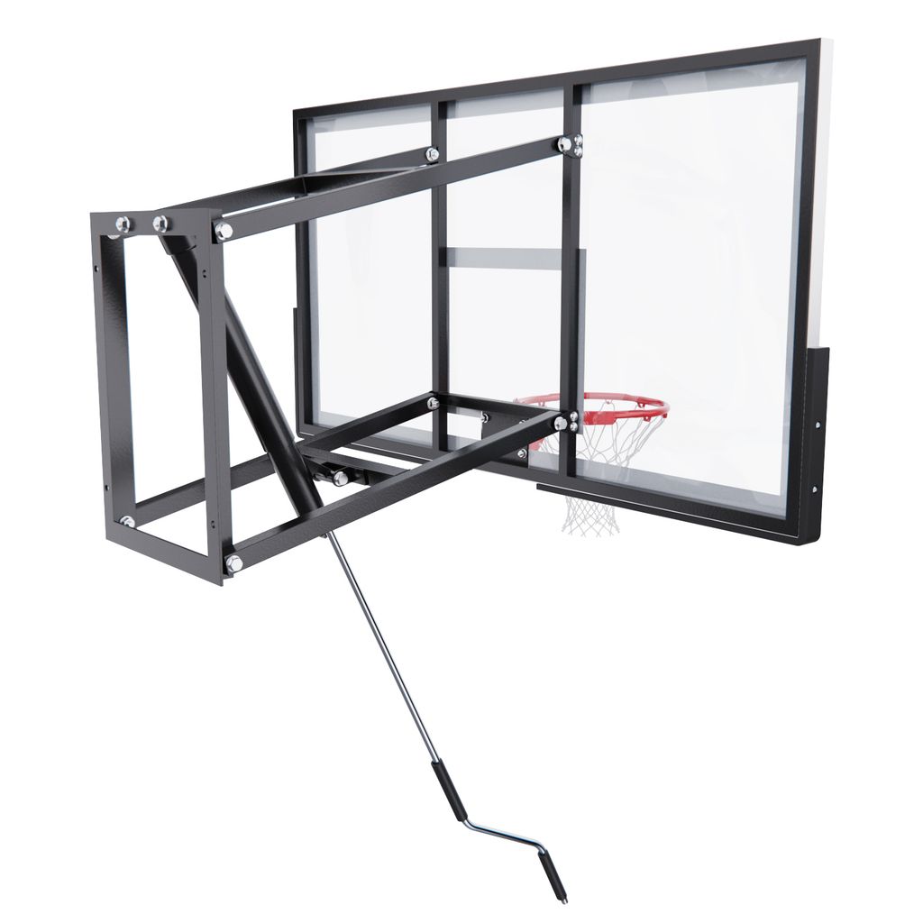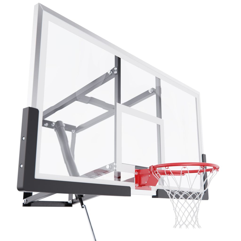 Щит изготовлен из прочного закалённого стекла толщиной 8 мм — материала, обеспечивающего отличный отскок мяча и устойчивость к ударам. Его размеры — 152 х 80 см, что делает его максимально приближенным к профессиональному оборудованию. Регулируемый вынос щита (51–55,5 см) повышает безопасность и удобство во время игры. Дополнительную безопасность обеспечивает защита Poly Pade, установленная по нижнему краю щита.