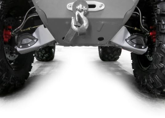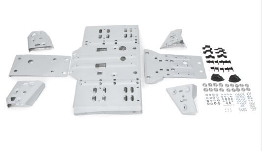 Алюминий 4 мм, лазерная резка, глубокий штамп, порошковая окраска. Установка в штатные места, скрытый крепеж. Защита порогов и отверстия для удаления грязи. Специальные силовые тарельчатые шайбы для крепления.