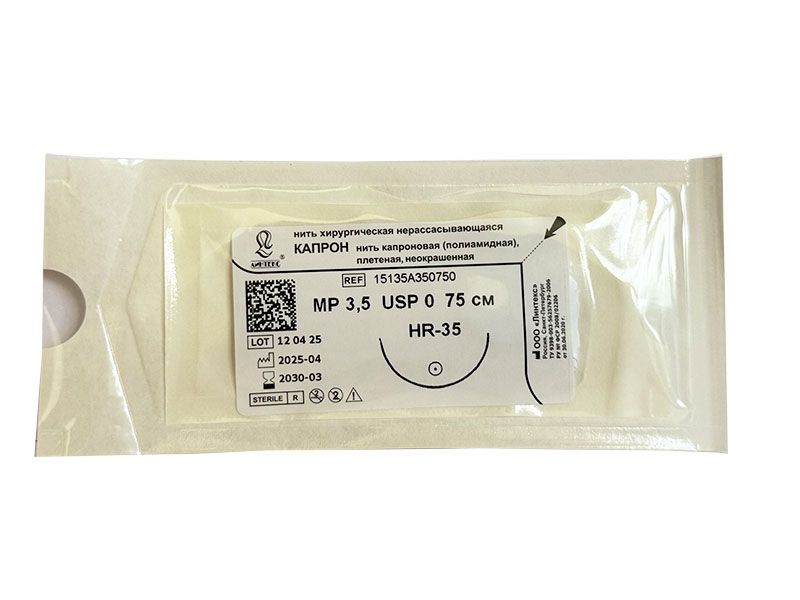 Капрон крученый неокрашенный МР(4), USP(1), длина 75 см, игла колющая HR-35, 1/2 окружности, Россия (ООО "Линтекс") 15340A350750