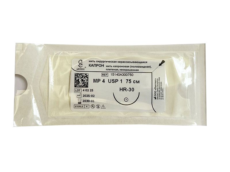 Капрон плетеный неокрашенный МР(4), USP(1), 75 см, игла колющая HR-30, 1/2 окружности, Россия (ООО "Линтекс") 15140A300750