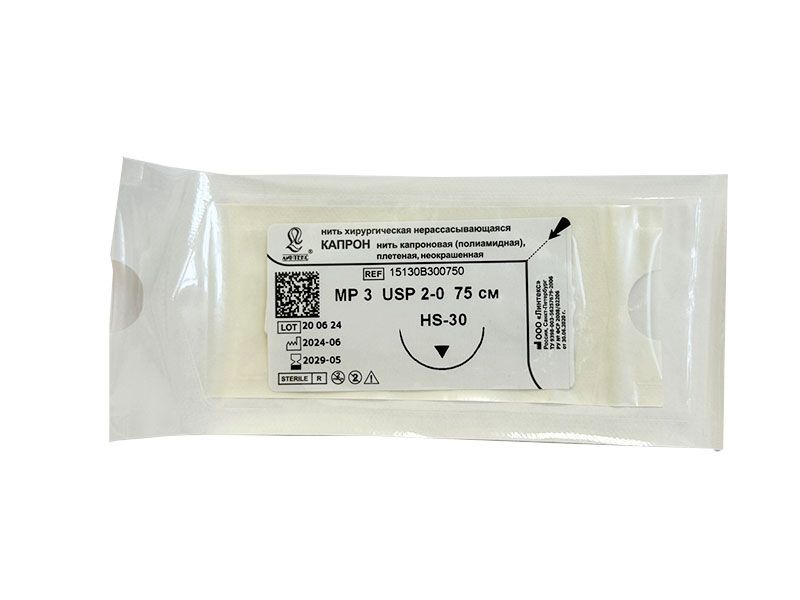 Капрон крученый неокрашенный МP(2), USP(3/0), длина 75 см, игла колющая HR-20, 1/2 окружности, Россия (ООО "Линтекс") 15320A200750