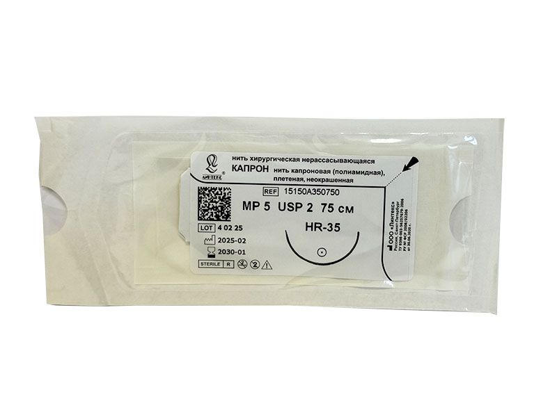 Капрон плетеный неокрашенный МР(5), USP(2), 75 см, игла колющая HR-35, 1/2 окружности, Россия (ООО "Линтекс") 15150A350750
