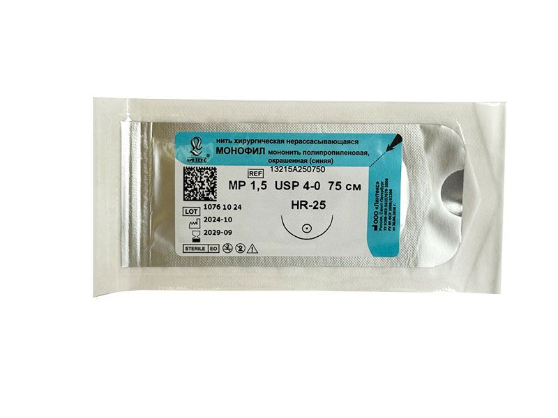 Монофил синий МР(1,5), USP(4/0), длина 75 см, игла колющая HR-25, 1/2 окружности, Россия (ООО "Линтекс") 13215A250750