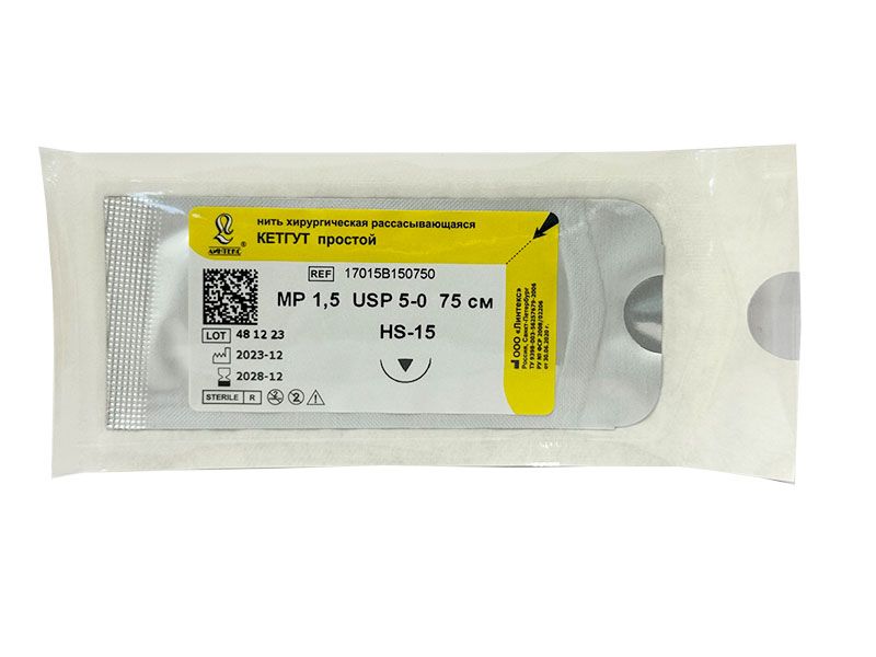 Кетгут простой МР(1,5), USР(5/0), длина 75 см, игла обратно-режущая HS-15, 1/2 окружности, Россия (ООО "Линтекс") 17015В150750