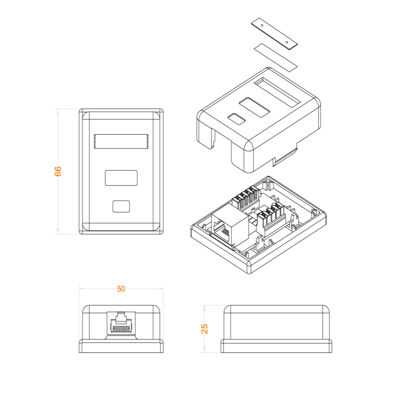 Hyperline SB1-1-8P8C-C5e-WH Розетка компьютерная RJ-45(8P8C), категория 5e, одинарная, внешняя, Dual IDC