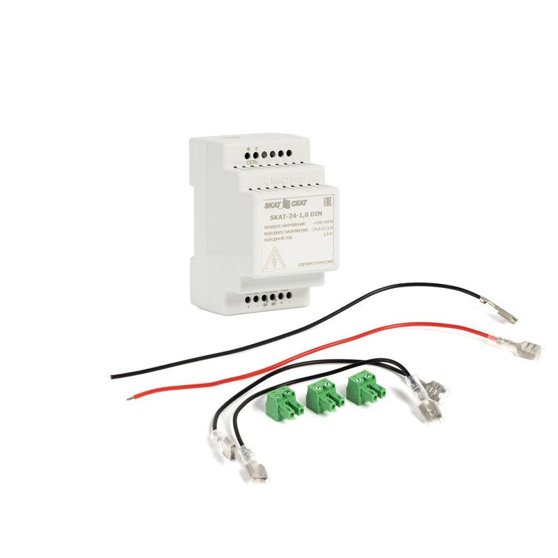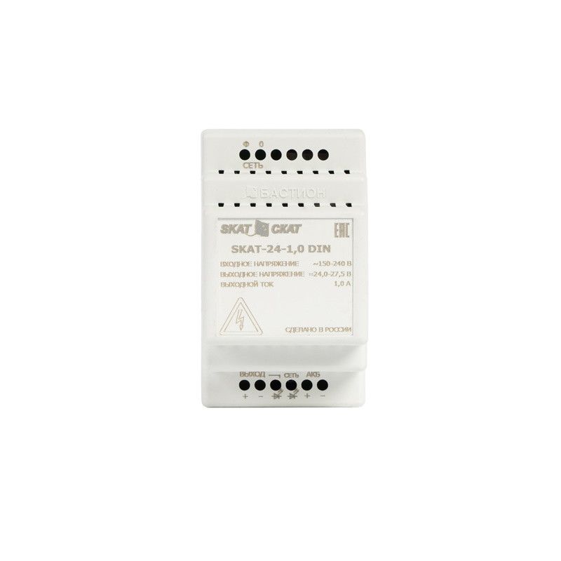 SKAT-24-1.0-DIN Источник вторичного питания 24В 1А пластиковый корпус под DIN рейку 35 мм Внешний АКБ от 4,5Ач. Защита от КЗ в нагрузке, защита АКБ от глубокого разряда и переполюсовки. Размер 53х88х71 мм