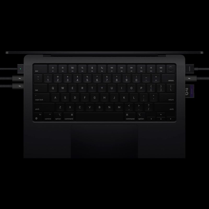 MacBook Pro оснащены всеми необходимыми портами. В числе доступных интерфейсов — три порта USB-C, совмещённых с Thunderbolt, разъём HDMI, слот для карт памяти SDXC и стандартный аудиоразъём 3,5 мм с поддержкой высокоомных наушников. Такое количество портов обеспечивает гибкость для подключения внешних мониторов, профессионального аудиооборудования и любых аксессуаров, в том числе при подключении Thunderbolt-периферии по цепочке или через хабы и донглы, что делает MacBook Pro бескомпромиссным инструментом.