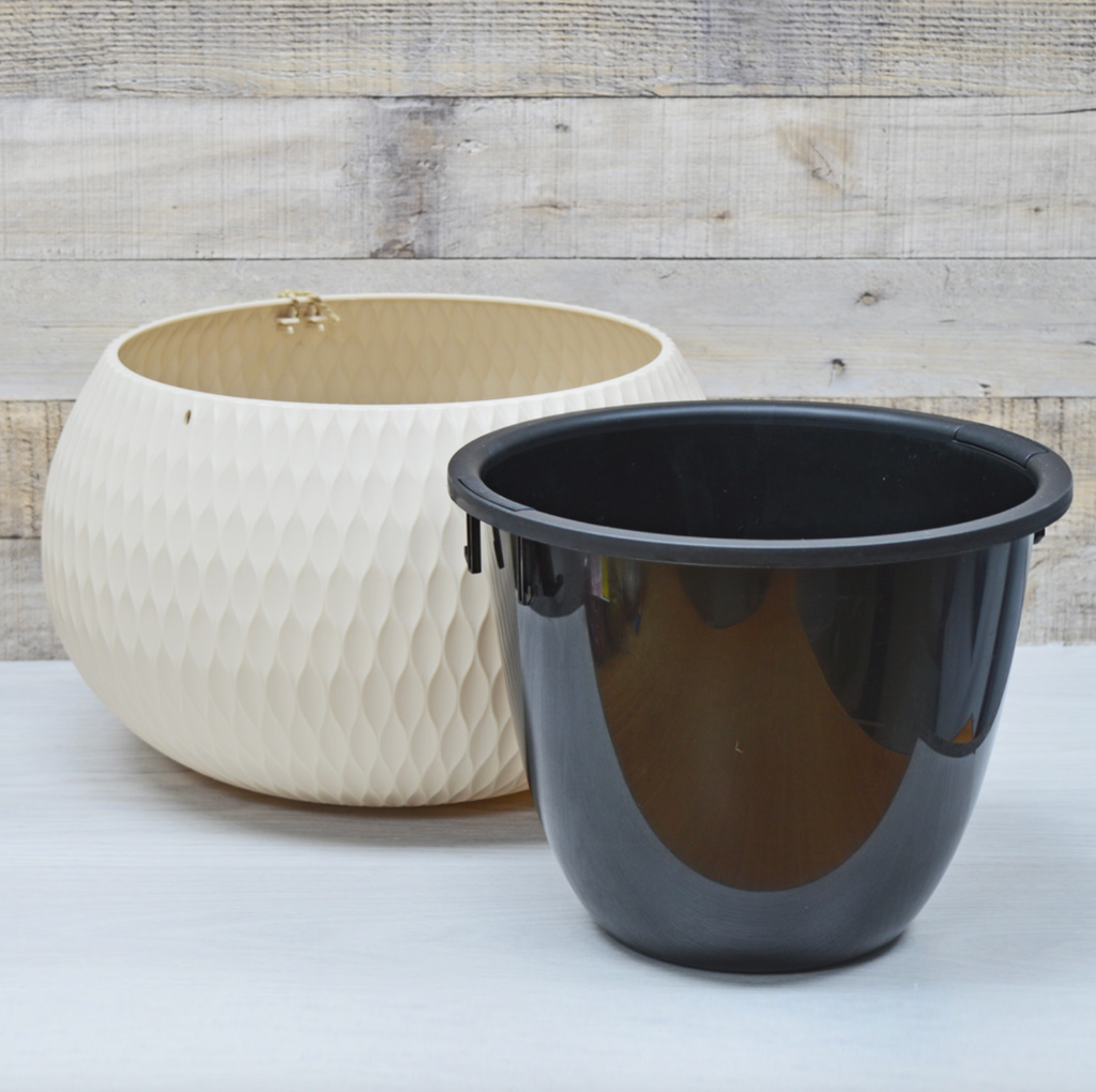 Кашпо состоит из двух частей. Внутренняя вставка имеет отверстия и предотвращает перелив растений и загнивание корней. Внешняя часть защищает кашпо от протекания, а многогранная поверхность придает визуальную легкость и особенную эстетику изделию.