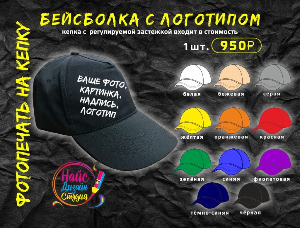 размер регулируется, цвета в ассортименте, Ваша идея в нашем исполнении: принт, логотип, картинка, фото, надпись