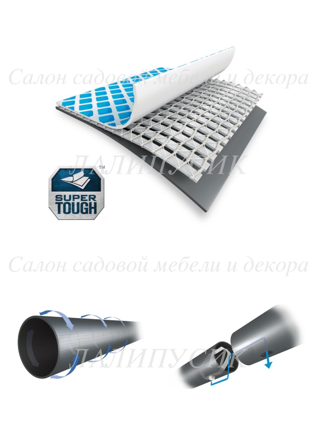 Технология SUPER-TOUGH обеспечивает надежность и долговечность бассейна. Материал чаши бассейна состоит из трех слоев: два слоя плотного винила и один - полиэстр для особой прочности. По периметру бассейна проходит лента из полипропилена, которая придает дополнительную прочность и устойчивость каркасу. Он не подвержен воздействию солнечных лучей, растягиванию и истиранию. Толщина стенок полотна - 0,67 мм. Также прочность бассейна Ultra Frame обуславливается его стальным каркасом, благодаря которому бассейн выдерживает большие нагрузки, в нем одновременно могут купаться несколько человек, как взрослых так и детей.