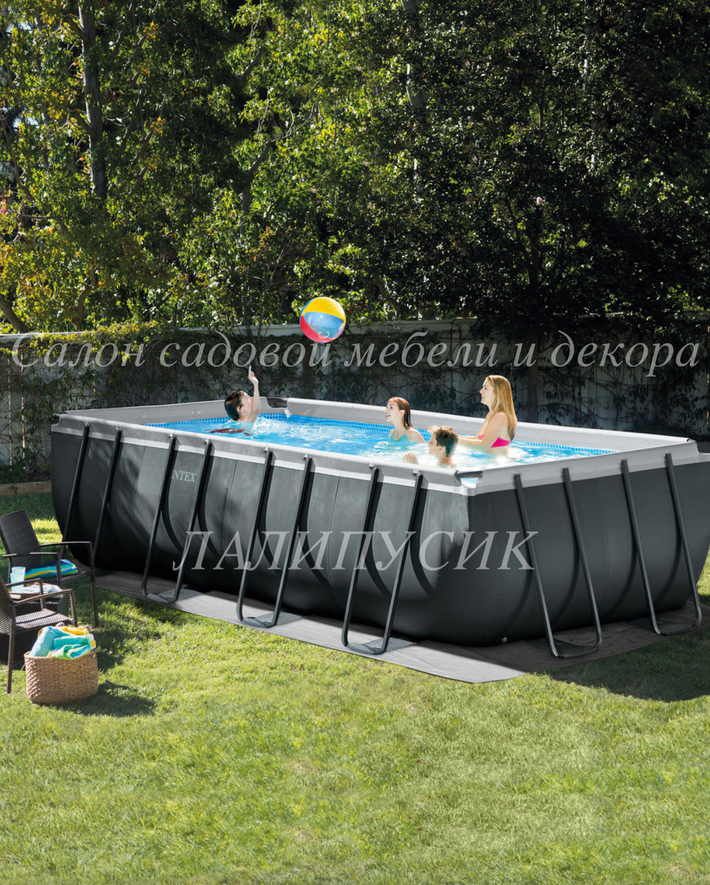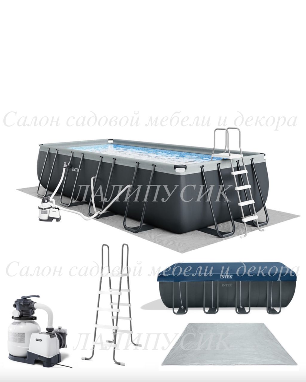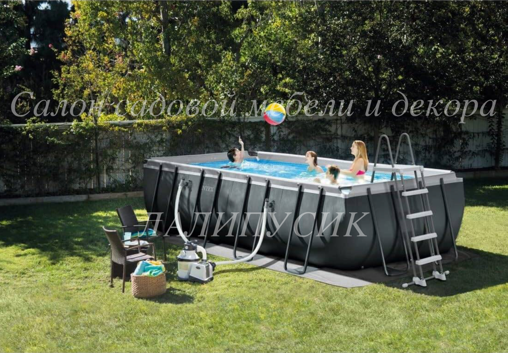 Сборный каркасный бассейн серии Intex Ultra Frame комплектации DELUXE с песочным фильтр-насосом, лестницей, тентом и подстилкой.