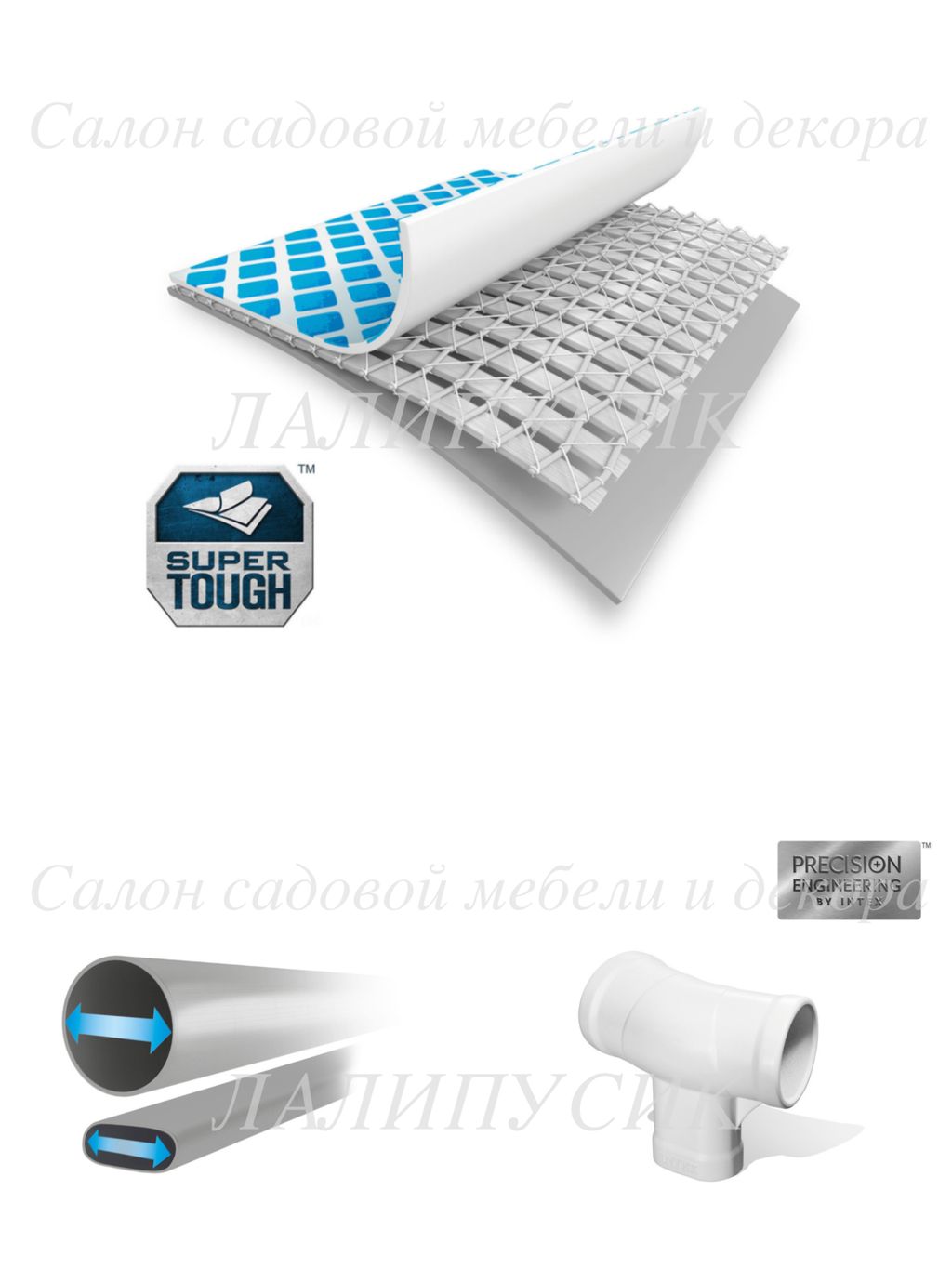 Технология SUPER-TOUGH обеспечивает надежность и долговечность бассейна. Материал чаши бассейна состоит из трех слоев: два слоя плотного винила и один - полиэстр для особой прочности. По периметру бассейна проходит лента из полипропилена, которая придает дополнительную прочность и устойчивость каркасу. Он не подвержен воздействию солнечных лучей, растягиванию и истиранию. Толщина стенок полотна - 0,67 мм. Также прочность бассейна Prism Frame обуславливается его стальным каркасом, благодаря которому бассейн выдерживает большие нагрузки, в нем одновременно могут купаться несколько человек, как взрослых так и детей.