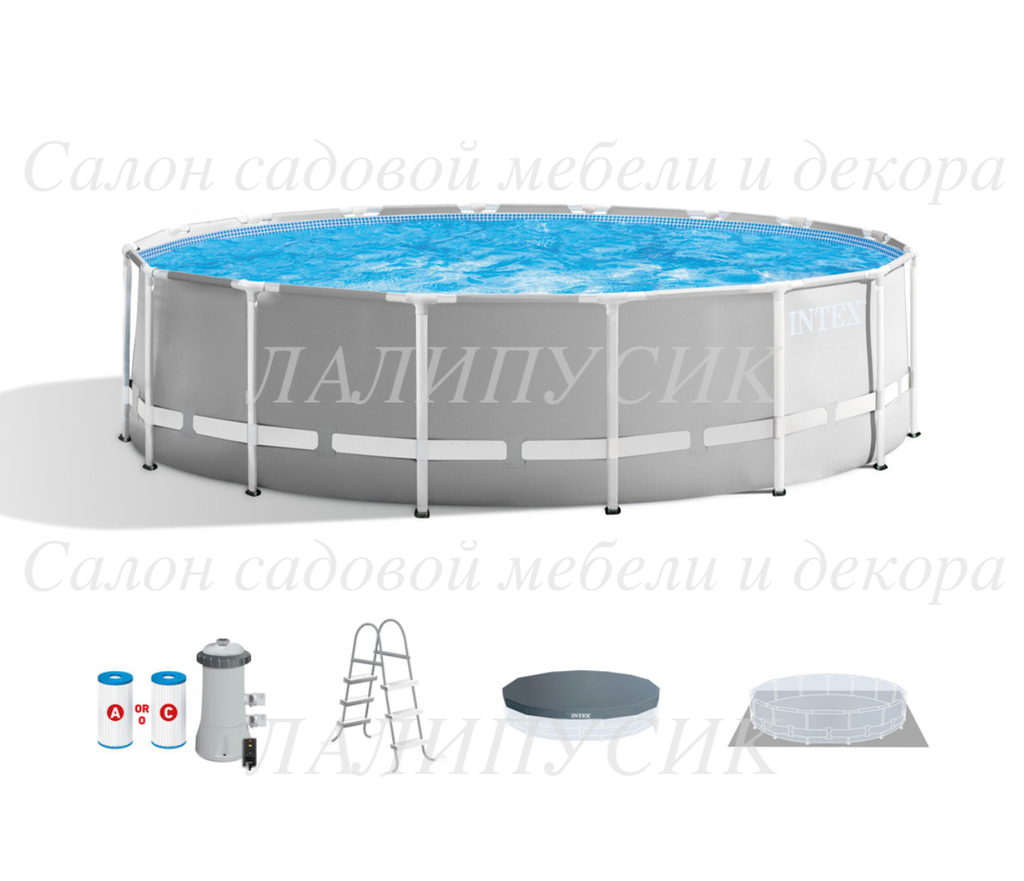 Сборный каркасный бассейн серии Intex Prism Frame комплектации с фильтр-насосом, лестницей, тентом и подстилкой.