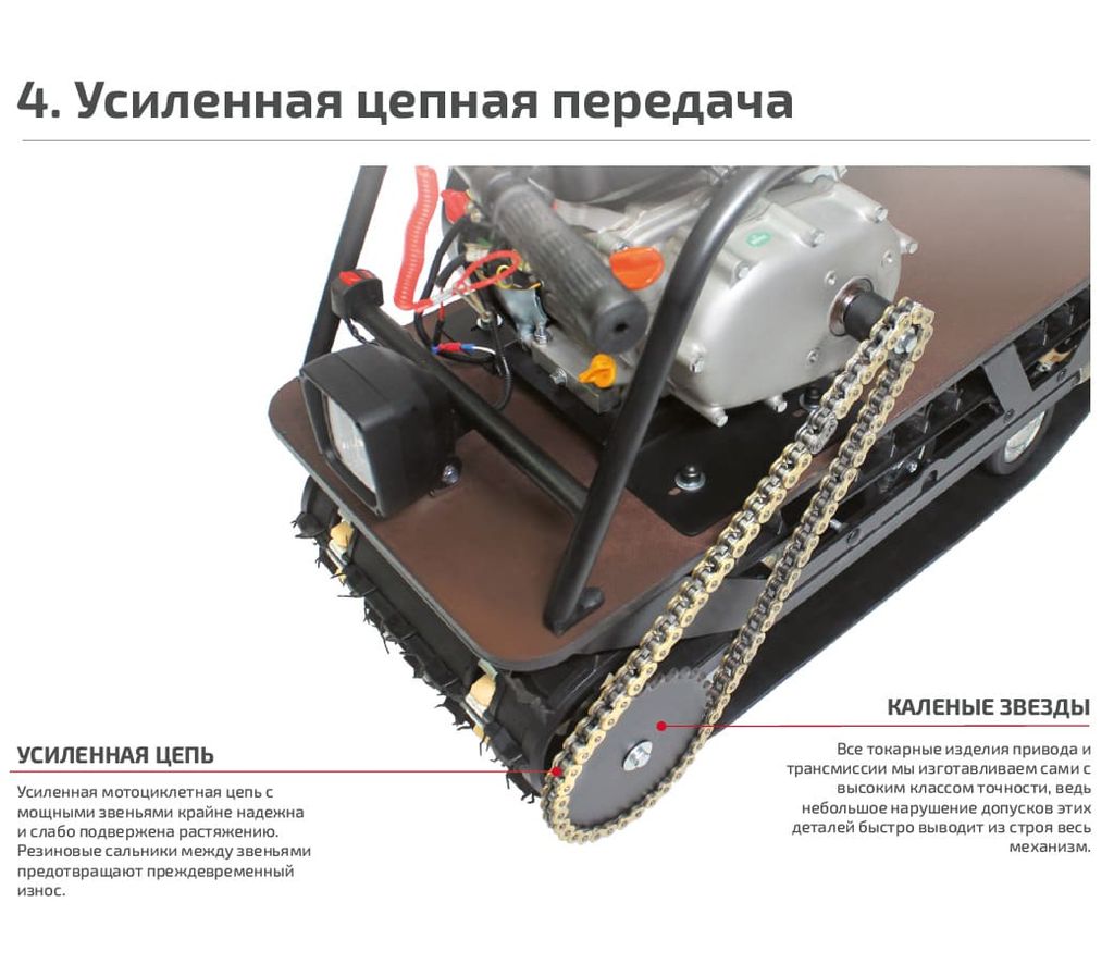 Мотособака оснащена специальной гусеницей Composit, которая обеспечивает отличное сцепление со снегом и со льдом благодаря своим техническим качествам, а также тракторным механизмом натяжения цепи.