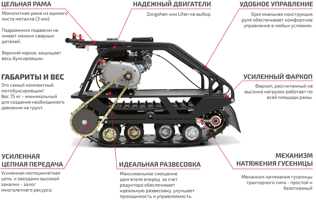 Мотобукс весит 80 кг, а размеры его составляют 100 см в длину, 43 см в ширину и 70 см в высоту. Модель оснащена гусеницей шириной 380 мм. Гусеница в сочетании с катковой подвеской способна проходить спокойно по льду и даже по территории без снега.