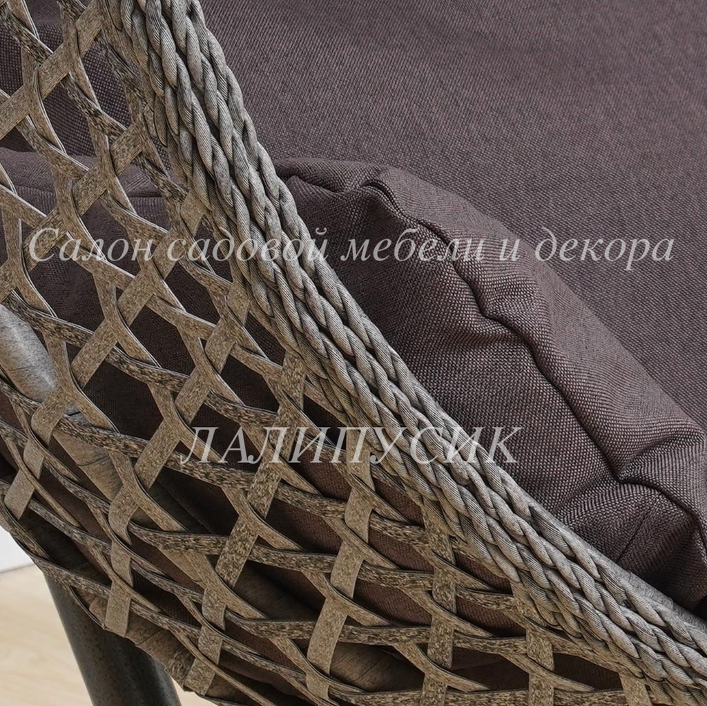 Оплетено кресло ручным способом искусственным ротангом, который не подвержен воздействию погодных условий, не выгорает на солнце и спокойно реагирует на влагу. Такое кресло вы можете оставлять на улице и даже спустя время оно не потеряет своего первоначального вида.