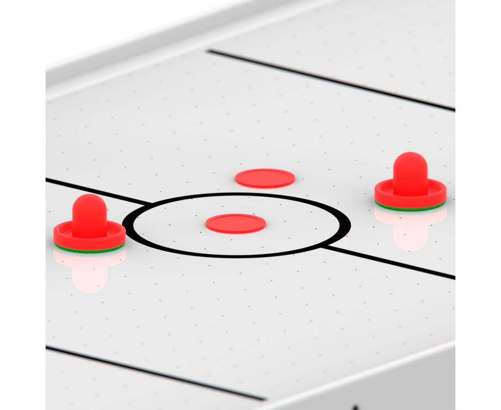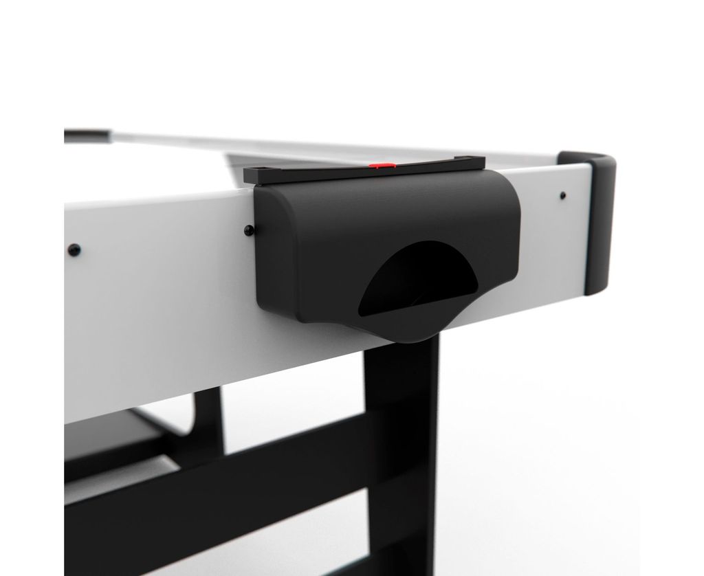 Стол оборудован электронным табло для подсчета очков. Питание счетчика: 2 батарейки, тип ААА. Складная конструкция позволит экономить место в перерывах между играми. Корпус выполнен из специально обработанного МДФ, сверху покрытого прочным пластиком. Мощный компрессор подает воздух через отверстия. Напряжение 220В.