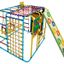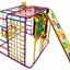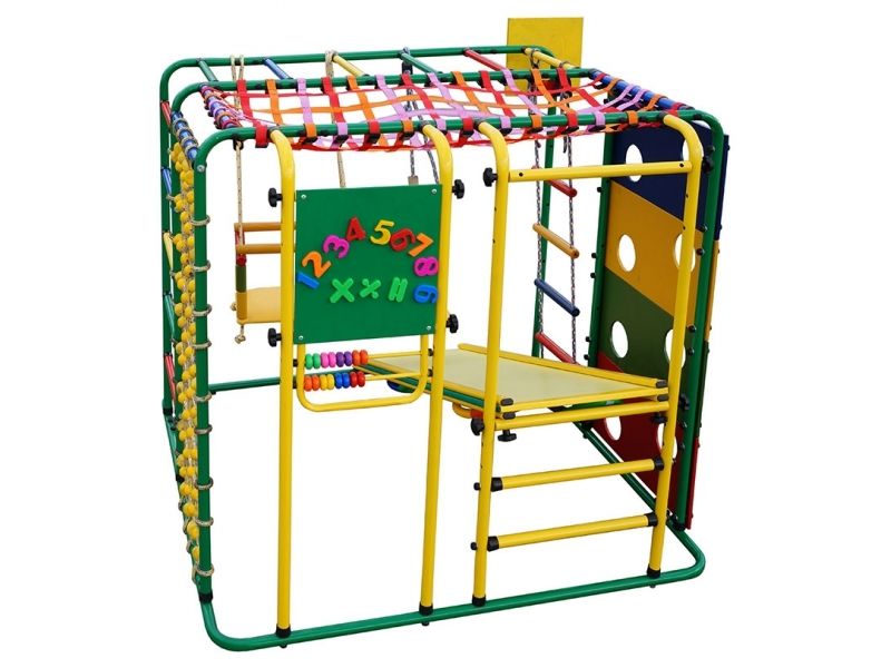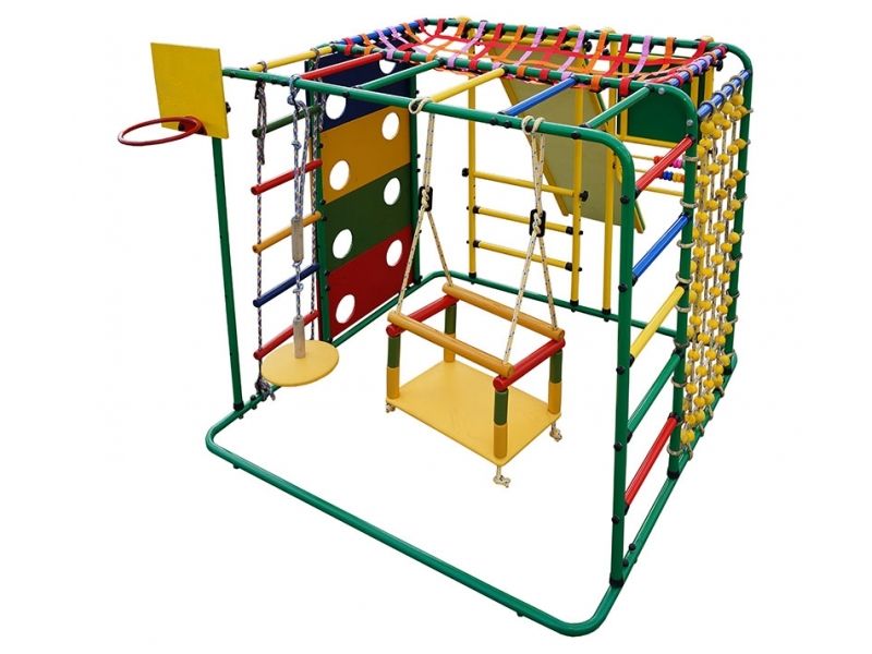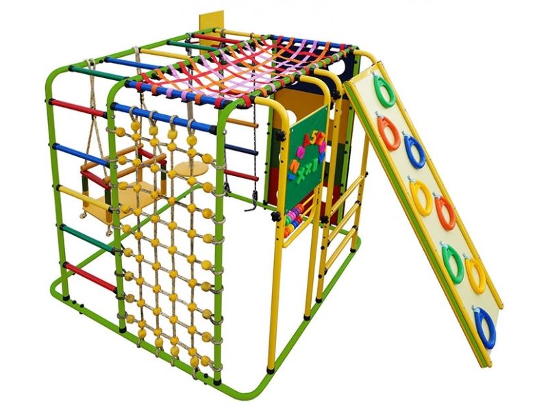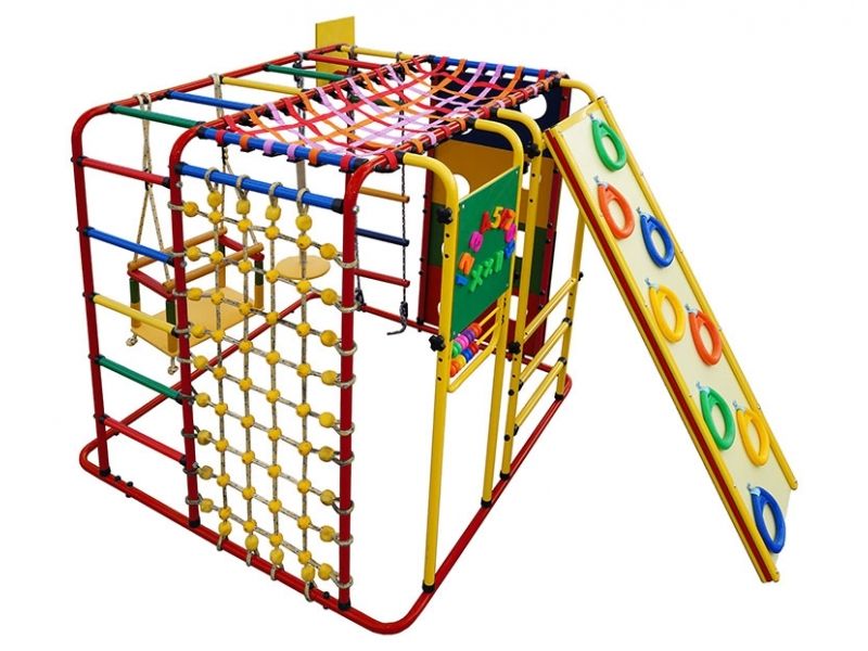 Комплектация: тарзанка, веревочная лестница, качели, сетка для лазания, панель с отверстиями, горка - скалодром с кольцами, баскетбольное кольцо, сетка-гамак, мольберт со счетами.