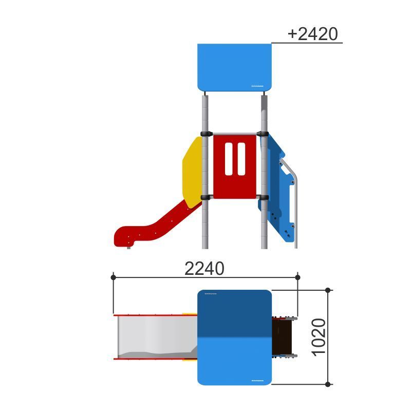 Небольшой игровой домик с горкой и крышей для детских игровых площадок. Для малышей, которые впервые знакомятся с площадками. Позволяет детям развивать координацию и ловкость.