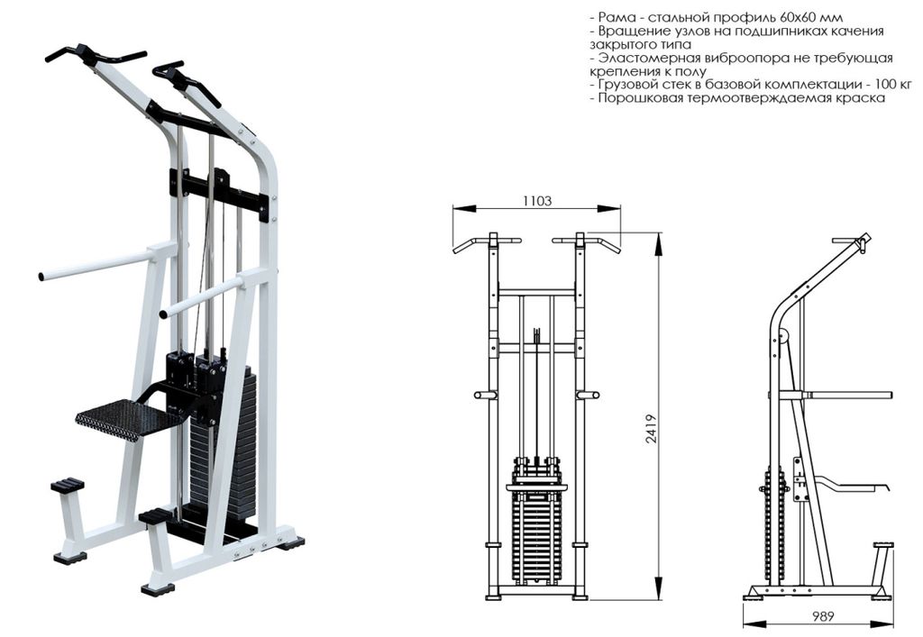 - Конструкция тренажера изготовлена из стального профиля 60х60мм, в изделии используется конструкционный профиль толщиной 2 и 3мм в зависимости от прилагаемой нагрузки;