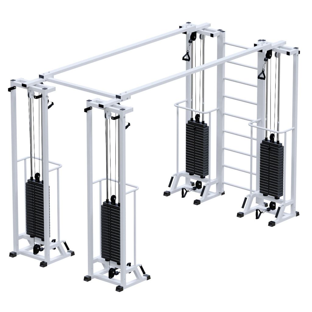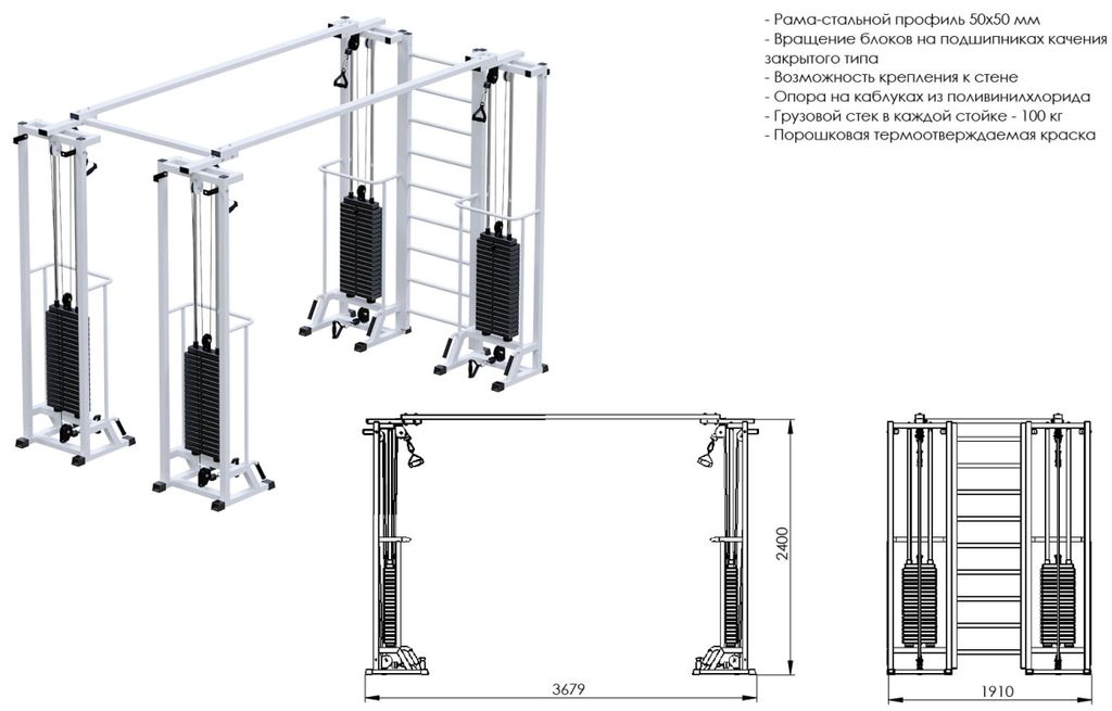 - Грузоблочные стеки тренажера состоят из металлических обрезиненных плит весом по 5кг, и хромированных направляющих. Изменение нагрузки происходит при помощи металлической иглы(фиксатора). Для приведения в движение грузов используется трос 5 мм в пвх оплетке с усилием на разрыв 500 кг с максимальной нагрузкой – 800кг;