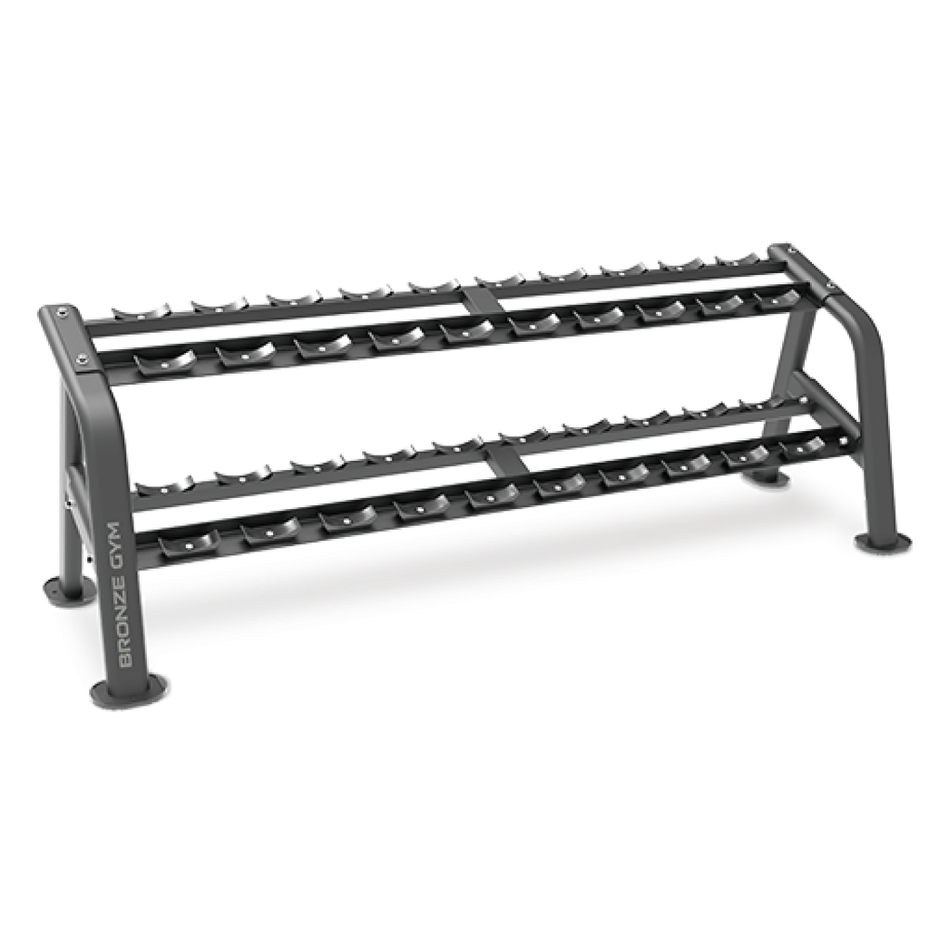 BRONZE GYM BR-1025 - коммерческая стойка для гантелей. Каркас оборудования выполнен из профиля 50*100 мм полукруглого сечения толщиной 2,5 мм. Имеет 20 секций для размещения гантелей. Размер стойки 248*74*79 см.