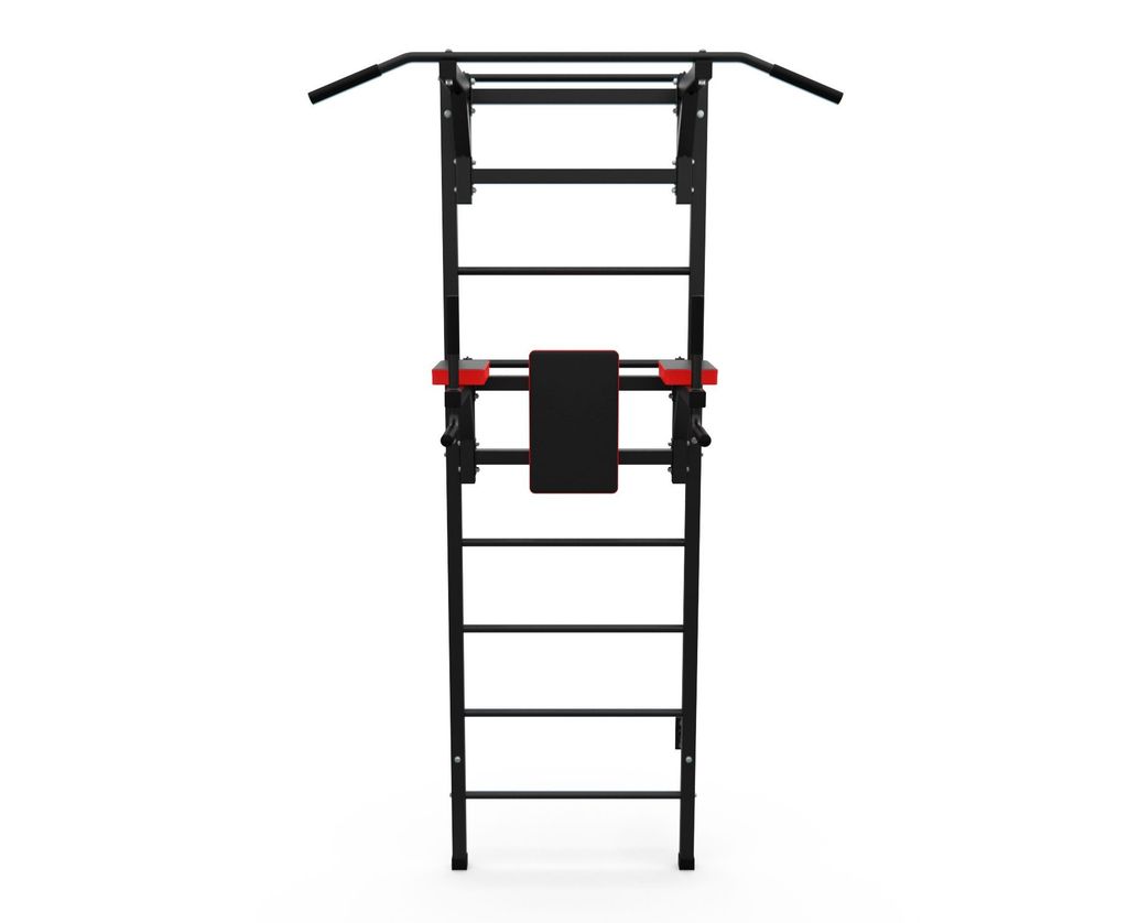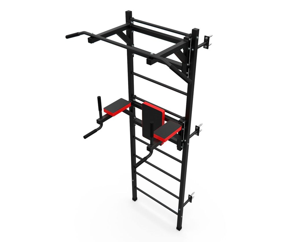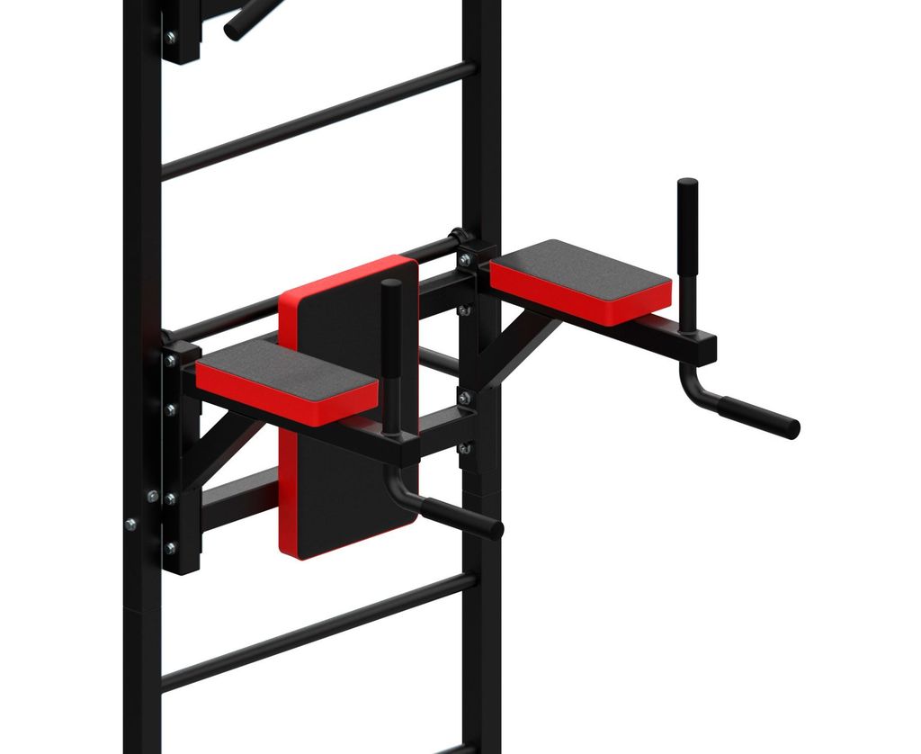 Турник длиной 99 см оснащён мягкими неопреновыми ручками, очень легко перевешивается на перекладины шведской стенки, что позволяет менять его высоту. Расстояние от ручек турника до шведской стенки (вынос турника) - 72 см. Вынос брусьев – 87 см, размер подушки под спину 42 х 25 см, а её толщина 5 см. Подушки подлокотников размерами 25 х 13 х 5 см, а поручни длиной 32 см диаметром 25 мм и толщиной стали 1,5 мм.