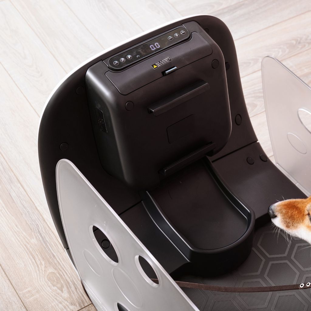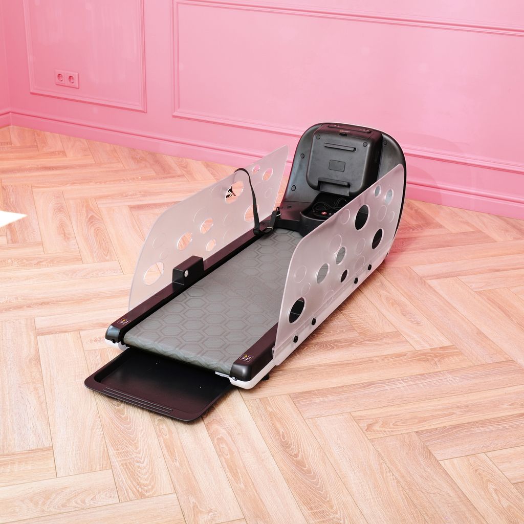 Размеры беговой дорожки составляют 121х49х44,5 см, а двигатель мощностью 100 Вт работает бесшумно, чтобы не испугать собаку. Беговое полотно имеет размеры 85х35 см и позволяет собаке двигаться со скоростью от 1 до 5 км/ч.