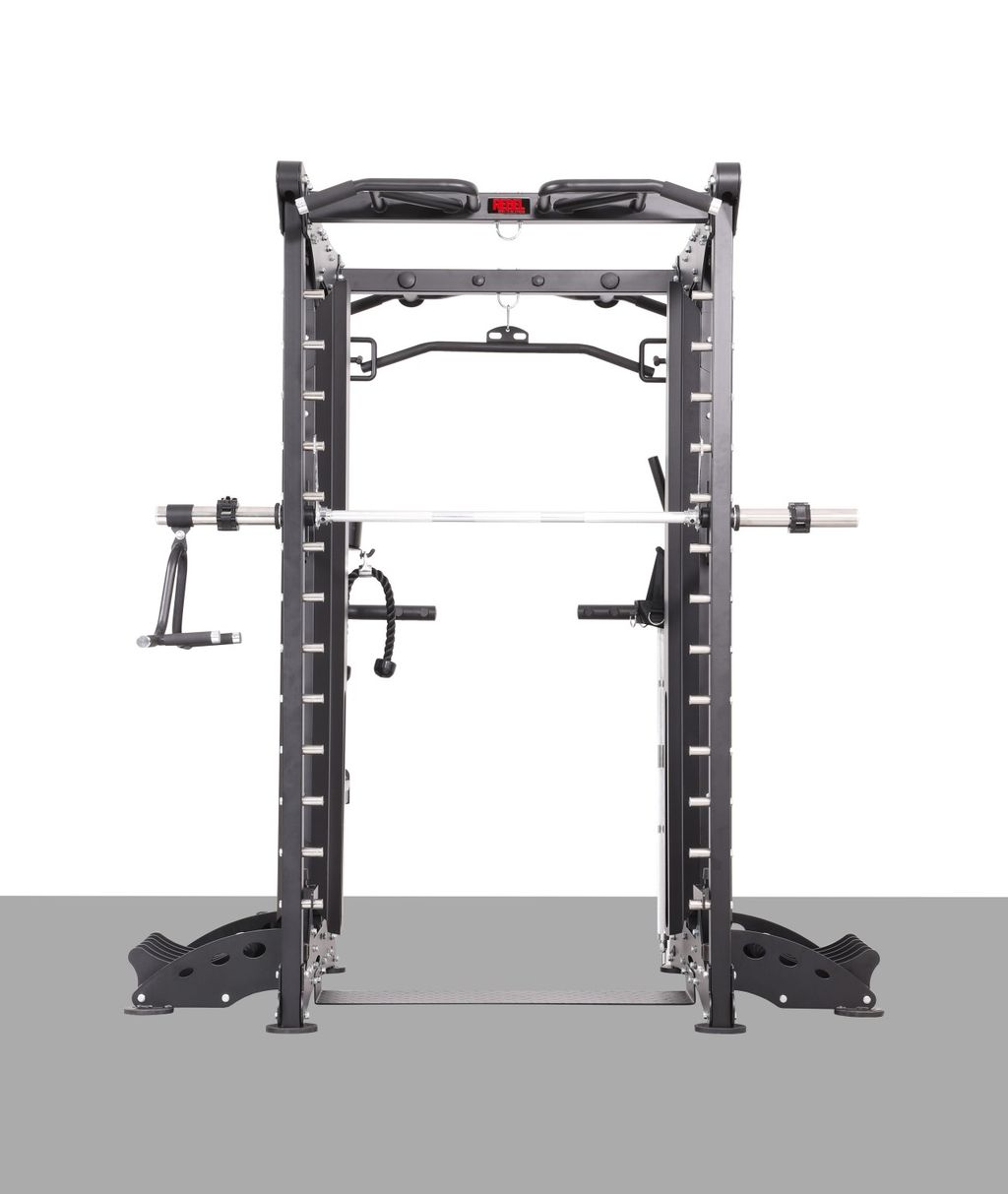 Машина Смита мультикомплекса имеет встроенный несъемный гриф со страховочными захватами, перемещающийся в вертикальной плоскости на линейных подшипниках по цельнометаллическим каленым направляющим. Количество положений фиксации грифа в вертикальной плоскости – 12.