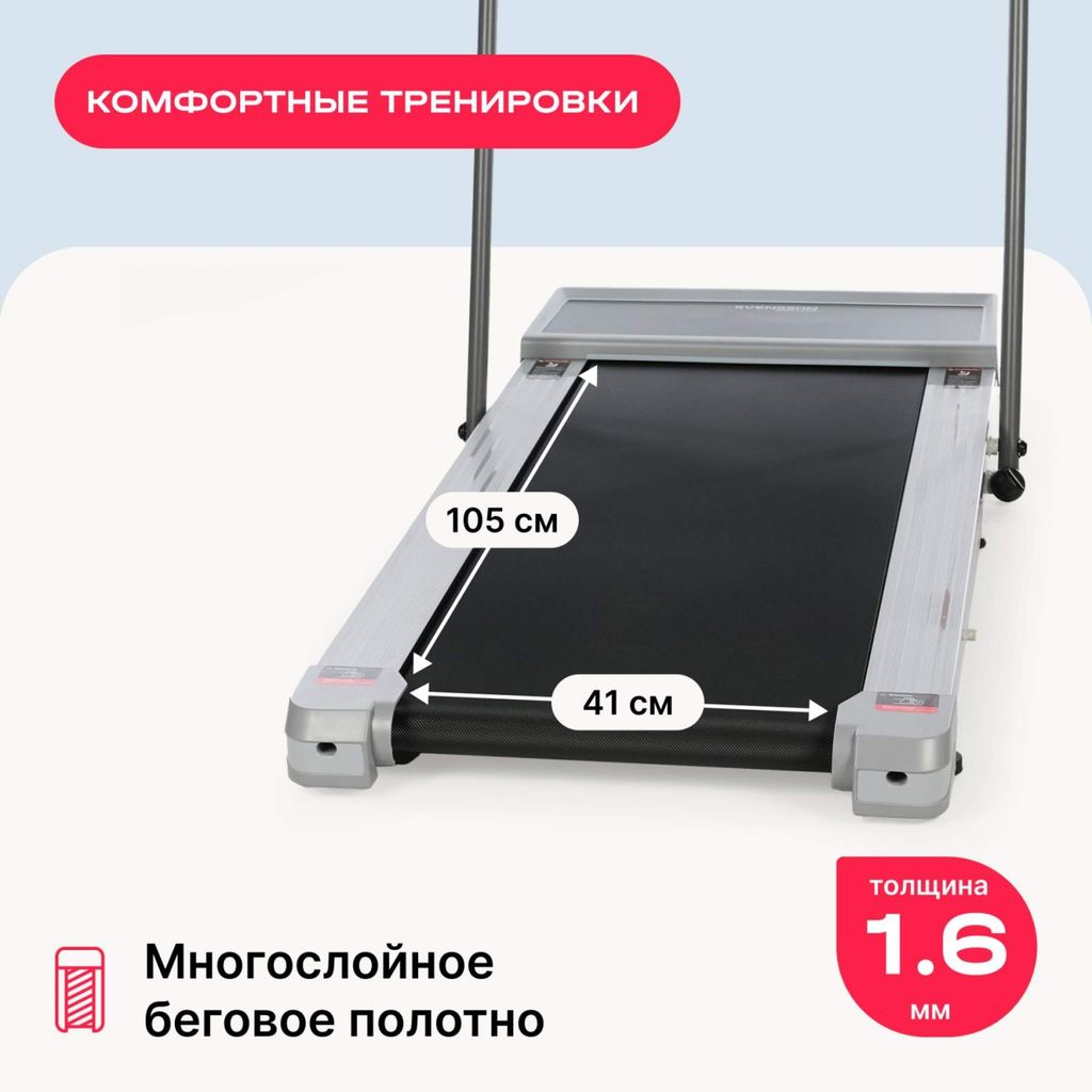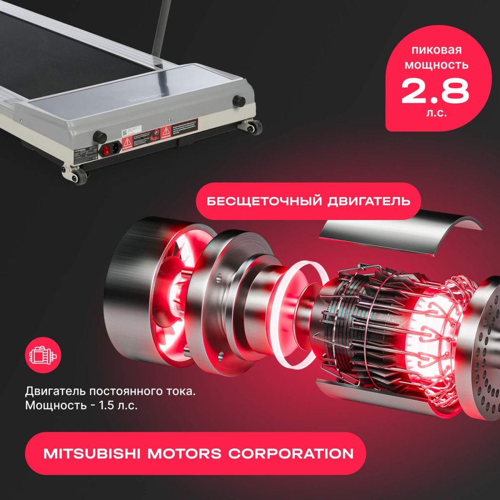 Электрическая беговая дорожка оснащена бесщеточным двигателем Mitsubishi Motors Corporation с мощностью 1,5 л.с. и пиковым показателем 2,8 л.с., что обеспечивает плавный разгон скорости от 1 до 12 км/ч. Комфортное беговое полотно размером 105х41 см с толщиной 1,6 мм и парафинированной декой (12 мм) дополнено системой BlueLine Safety — ярко-синей подсветкой моторного отсека, которая обеспечивает визуализацию линии стопа для большей безопасности. Два уровня механического наклона полотна позволяют варьировать нагрузку, а LED-дисплей с белой индикацией отображает ключевые параметры тренировки. Для синхронизации с мобильными приложениями Spax™ и Kinomap™ предусмотрен встроенный Bluetooth.