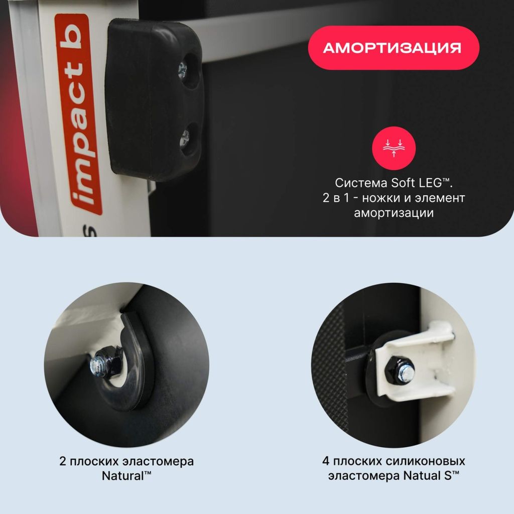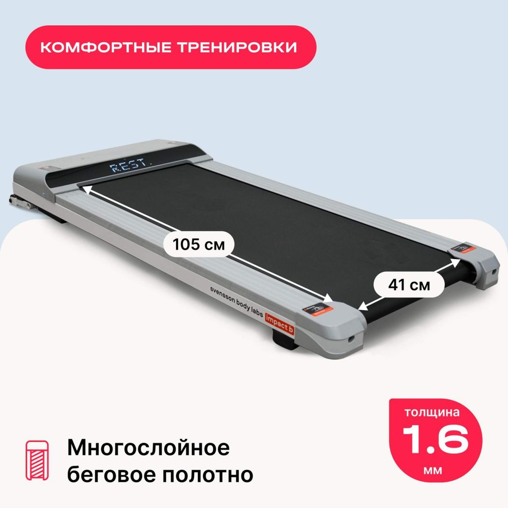 IMPACT B сочетает компактность, функциональность и готовность к использованию прямо из коробки. Вес тренажера составляет всего 25,2 кг, а его размеры составляют 137х60х15 см, что позволяет хранить дорожку в вертикальном положении у стены. При этом дорожка выдерживает максимальный вес пользователя до 100 кг, что делает ее универсальным решением для всей семьи. Ключевые преимущества Svensson Body Labs IMPACT B: • скорость от 1 до 10 км/ч;